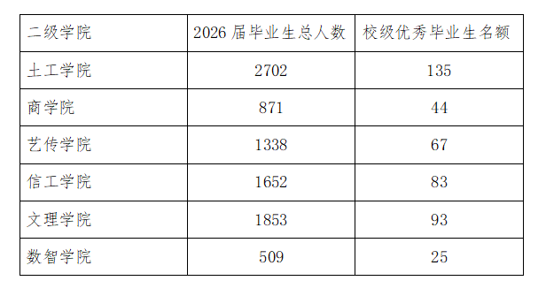 3.规定2026届校级优秀毕业生评定人数占比为学校2026届毕业生总人数的5%,各二级学院优秀毕业生评定人数按照不超过本学院2026届毕业生总人数的10%评选,详细名额分配如下表所示: