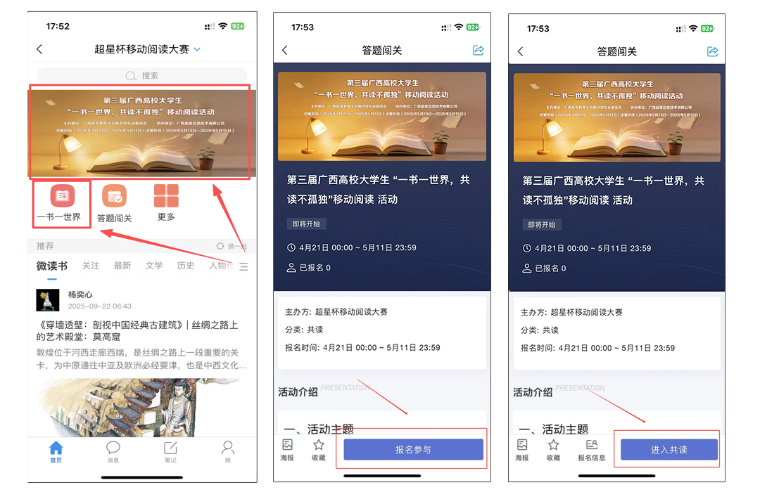②初赛阶段点击首页轮播图或者“一书一世界”模块,右下角点击报名参与按照提示完成报名,返回首页点击右下角进入共读界面阅读图书即可。