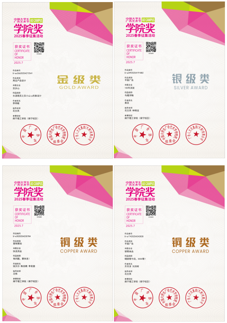 近日,我校艺术与传媒学院师生受邀赴京参加第21届中国大学生广告艺术节学院奖2025春季征集大赛颁奖盛典及策划案路演活动。我校师生在本次大赛中,共获全国总决赛金奖1项、银奖1项、铜奖2项,优秀奖34项,入围奖74项,石文燕等多位教师荣获“优秀指导教师奖”。