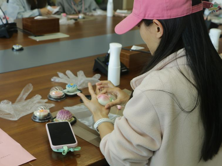 揉、捏、压、刻……指尖流转间,糯米粉化作一朵朵精致的茶果子。春樱粉、艾草青、茶蕊白,老师们为每一枚果子调配专属色彩,或点缀金箔,或雕琢花瓣,让传统非遗在巧手中焕发新生。当一枚枚独一无二的茶果子在掌心绽放,成就感与喜悦溢于言表。这不仅是一场手作体验,更是一次与传统文化的温柔对话。