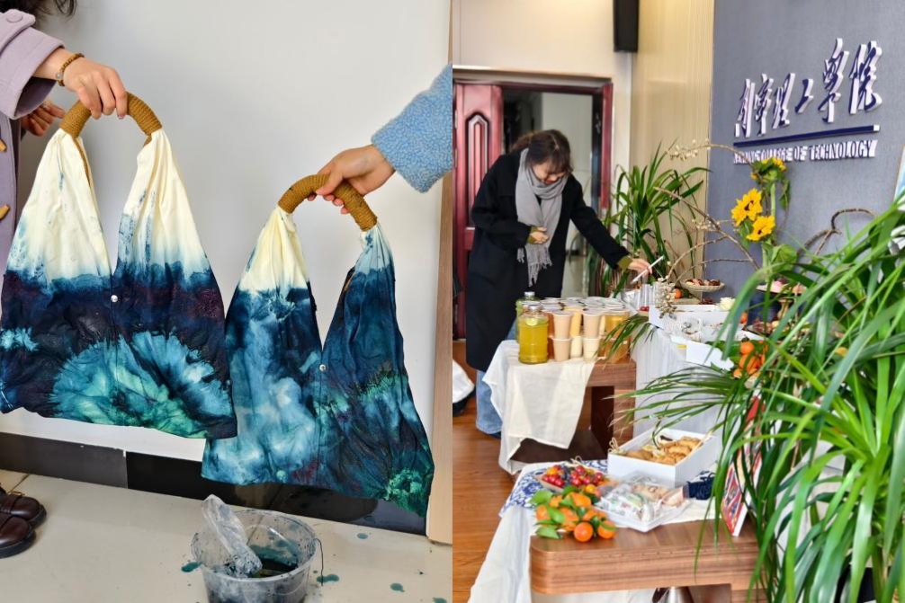 在桂林校区,一场“妙手生花”的扎染体验活动,正在用另一种方式诠释女性的创造力。当素白的布料在指尖折叠、捆扎,当染料在布面上晕染出不可复制的花纹,每一位参与者都在惊叹于自己双手创造出的奇迹。蓝与白的碰撞,传统与现代的交融,正如每一位女性身上多元而独特的魅力。活动现场还准备了精致的茶歇,老师们在创作之余,品一口清茶,与同事们聊聊生活与工作,享受难得的悠闲时光。