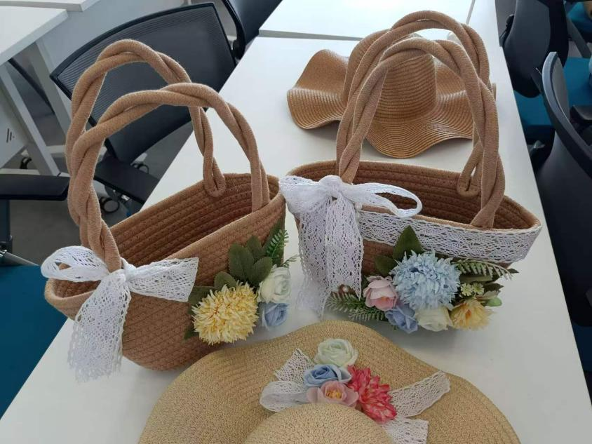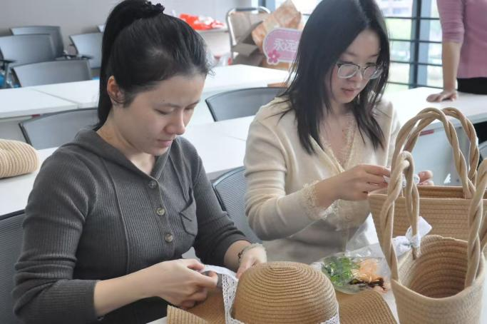 阳光洒落,花香满室。平日里握着粉笔、敲击键盘的手,此刻轻轻拈起花枝。素净的草帽、质朴的草编包,在老师们的巧手下渐次绽放——淡雅的桔梗、灵动的尤加利叶错落其间,普通的物件瞬间有了生机。这不仅是一场美的创作,更是一场心灵的放松。当指尖触碰花朵的柔软,时光仿佛慢了下来。老师们沉浸其中,将春天戴在头上、挎在肩头,也把这份明媚带回了日常。