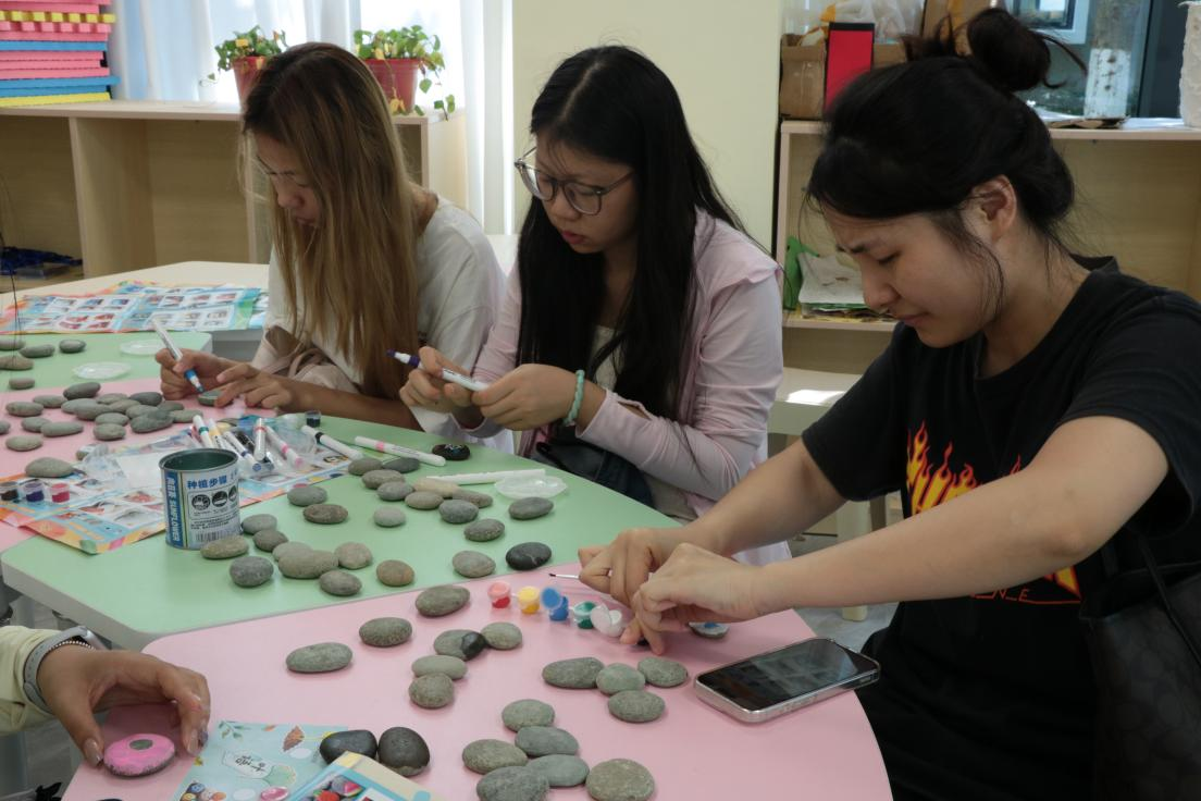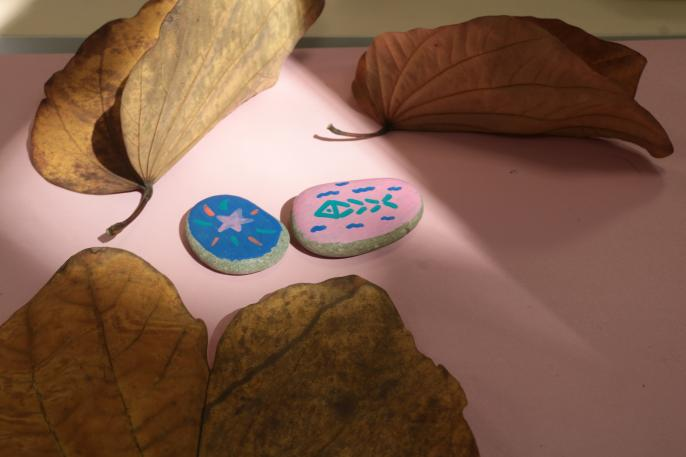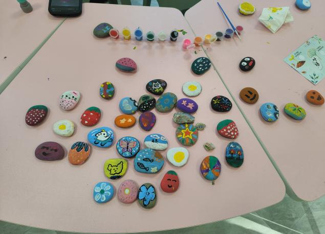 活动三“「石说心语」自然彩绘剧场”引导同学们挑选形态各异的石头,用环保颜料绘制充满想象力的图案,将内心情感凝聚于方寸之间。在随后的分享环节中,同学们通过作品讲述自己的心灵故事。参与同学动情地说:“在石头上画下星辰大海时,我仿佛遇见了内心最真实的自己。”