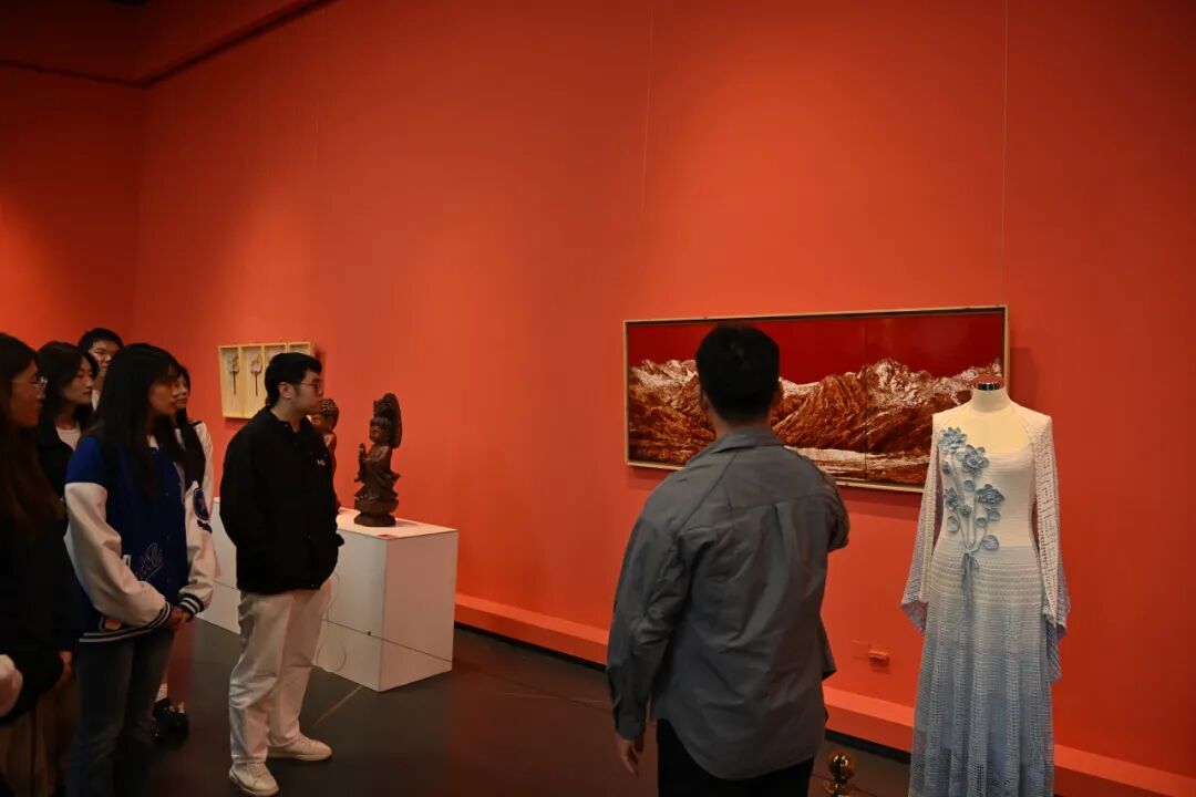 值得一提的是,研学过程中还穿插了干货满满的现场分享。陈广明院长结合展览中的工艺美术作品,沉浸式为同学们讲解饰品的设计巧思、工艺细节与文化内核,引导大家读懂饰品艺术中民族美学与国际审美的共生之道;同时还结合学院学科建设与艺术人才培养方向,着重强调艺术创作既要坚守民族根脉、深耕文化沃土,也要具备全球视野、勇于创新表达,不负“创意艺术菁英”的培养初心。