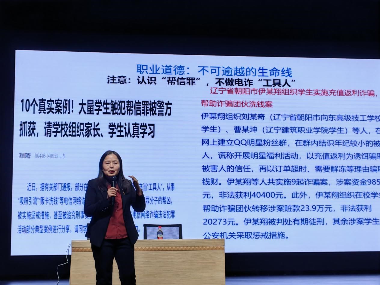 何教授的讲座内容层层递进,主要围绕四个方向展开。首先,在时代呼唤部分,她深刻阐述了未来职业所承载的社会责任与历史使命,强调了诚信操守和职业道德是职场人不可逾越的底线,引导学生从入门之初即筑牢思想根基。其次,在“行业瞭望——机会与趋势”环节,何教授结合自身丰富的实务经验与行业洞察,分析了在人工智能、大数据等技术浪潮冲击下,各行各业正在经历的深刻变革与未来发展趋势,指明了行业涌现的新机遇与对人才能力的新要求。最后,在“职场预热——能力储备”方面,她鼓励同学们面对智能时代,不仅要扎实掌握专业基础知识,更要主动培养数据思维、技术应用能力、批判性思维和终身学习的习惯,构建面向未来的复合型能力体系。