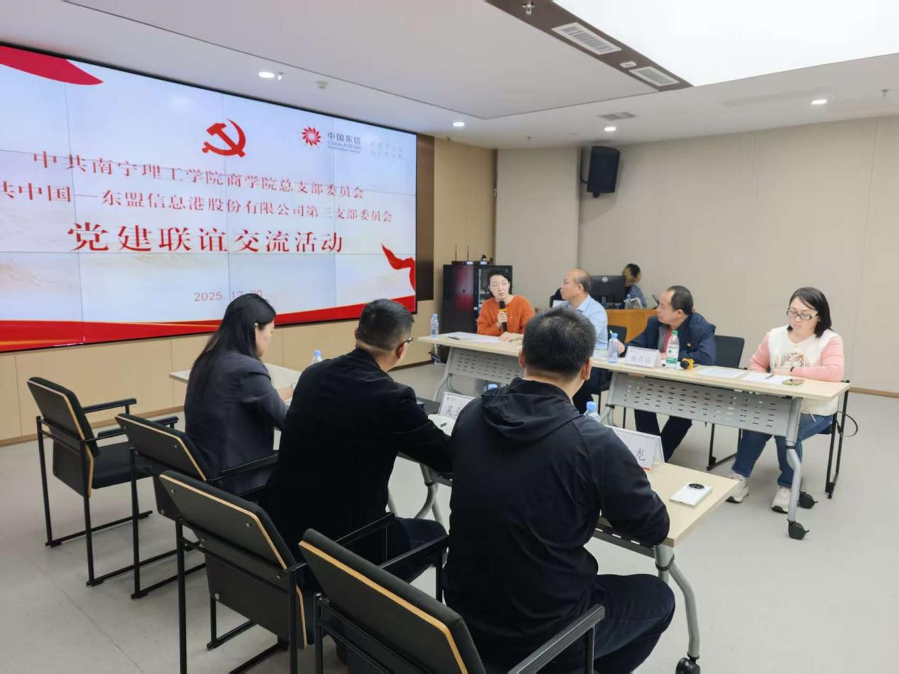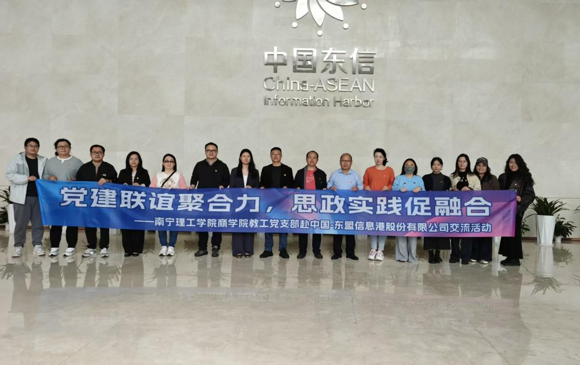 2025年12月20日,南宁理工学院商学院教工党支部组织全体党员赴中国—东盟信息港股份有限公司,开展以“党建引领、产教融合”为主题的校企党建联谊与业务交流活动。活动通过实地走访、座谈研讨,旨在展示支部党建成效、对接企业发展需求,探索校企协同新路径,推动党建工作与教学科研、企业发展深度融合。