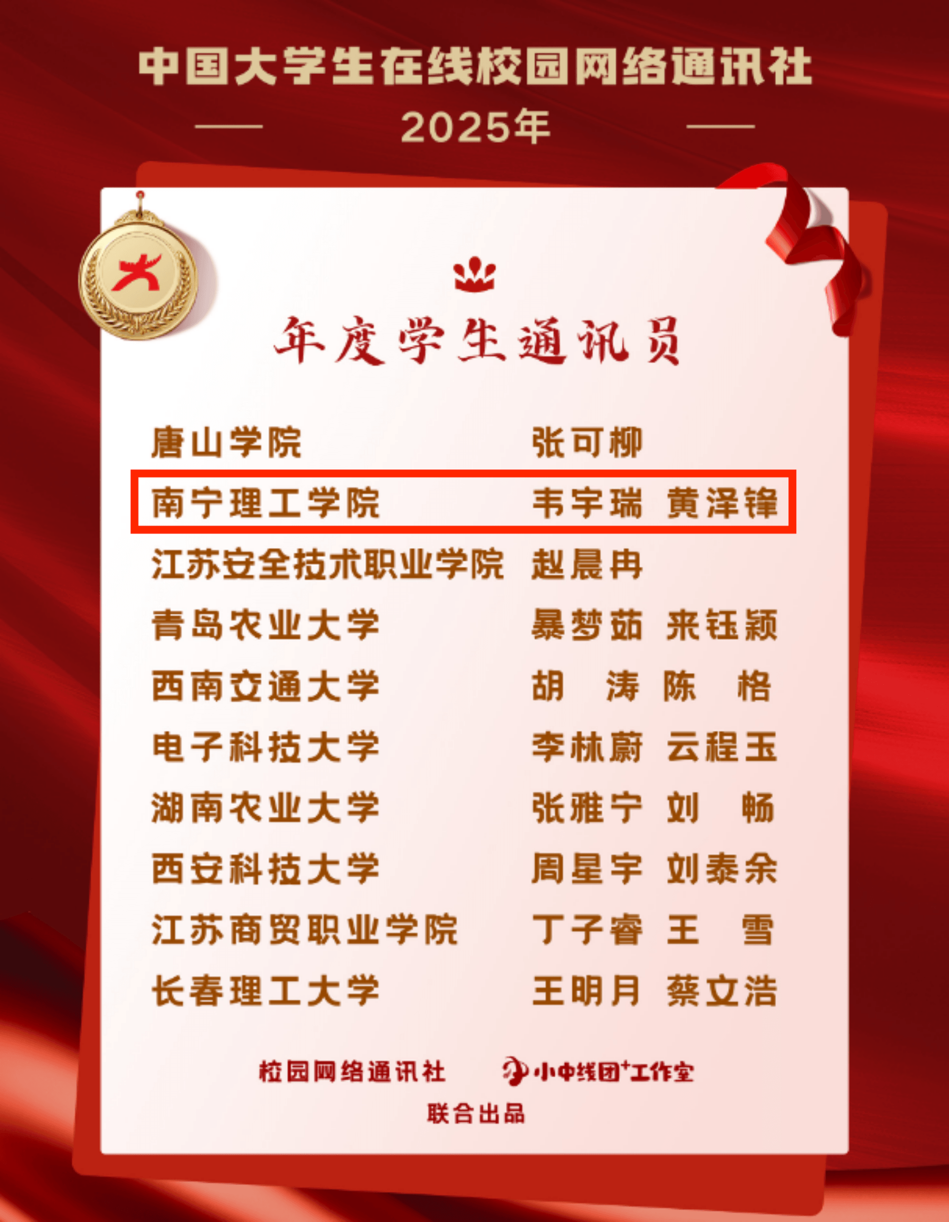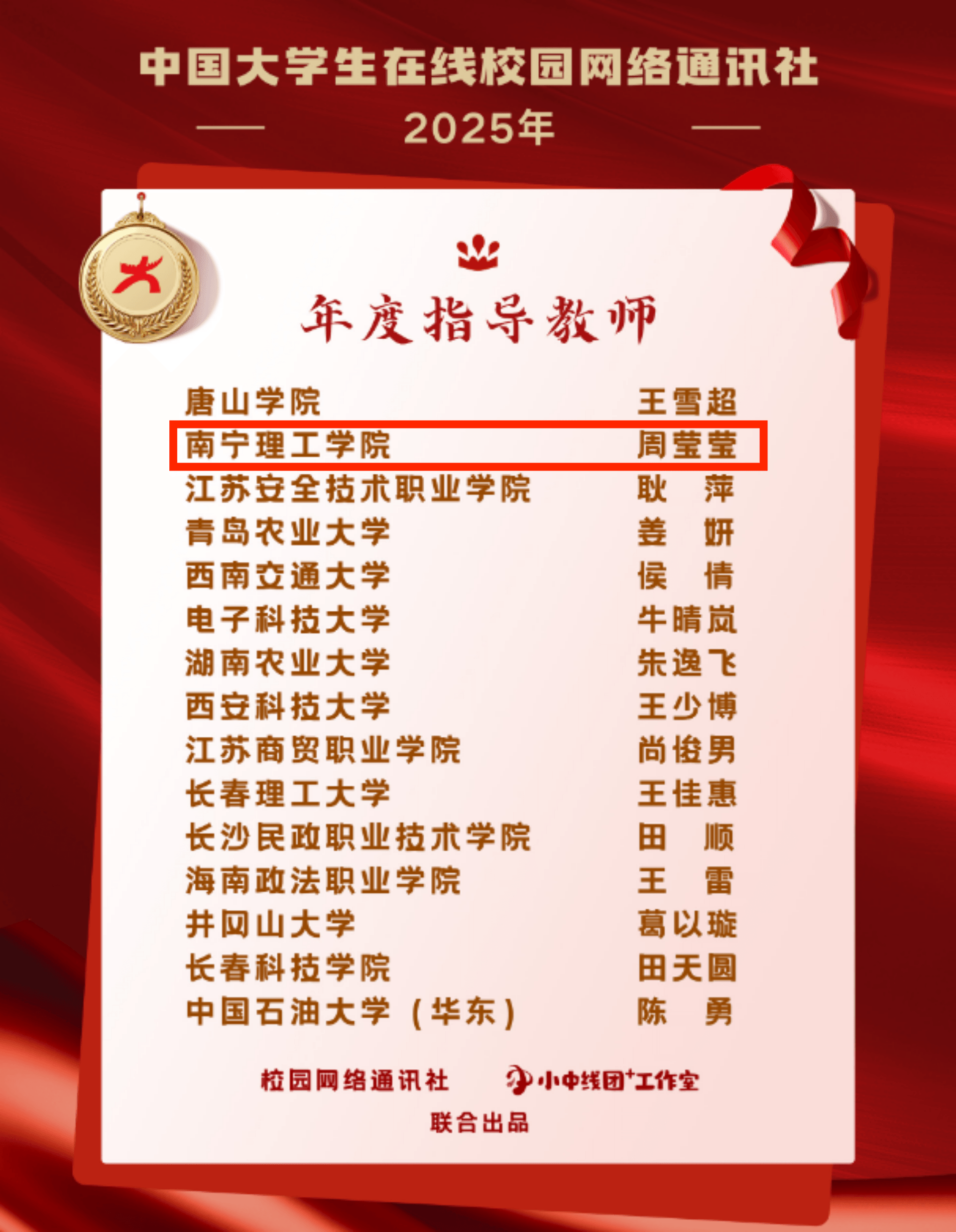 近日,教育部中国大学生在线公布了中国大学生在线校网通社2025年度总结榜单,我校获评中国大学生在线校园网络通讯社2025年“年度校网通站”和“年度网络文化活动优秀组织高校”,学生工作部(处)周莹莹老师荣获“年度指导教师”和“校园行活动年度指导教师”,土木与工程学院2023级本科生韦宇瑞同学、土木与工程学院2024级本科生黄泽锋同学荣获“年度学生通讯员”。