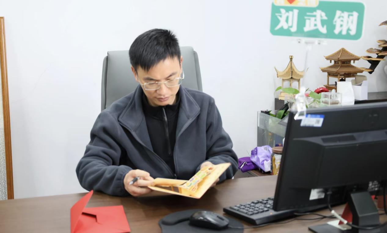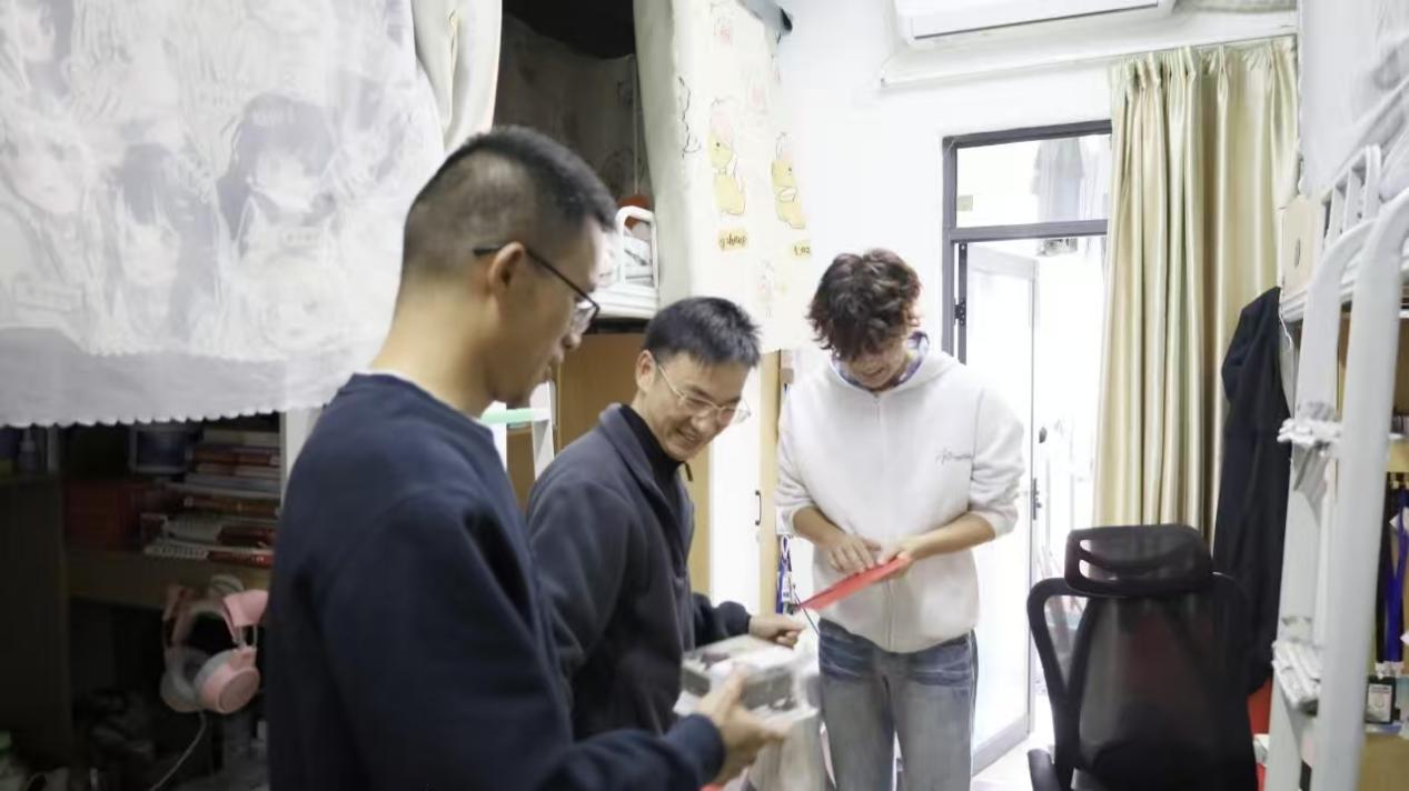 活动当天,刘武钢、陈广明两位老师手捧蛋糕,带着亲笔书写的贺卡来到宿舍。贺卡上,老师们结合创意艺术专业特色,勉励王旗深耕专业、大胆创新,同时送上对其身心健康、逐梦前行的美好祝福,字里行间满是关怀。