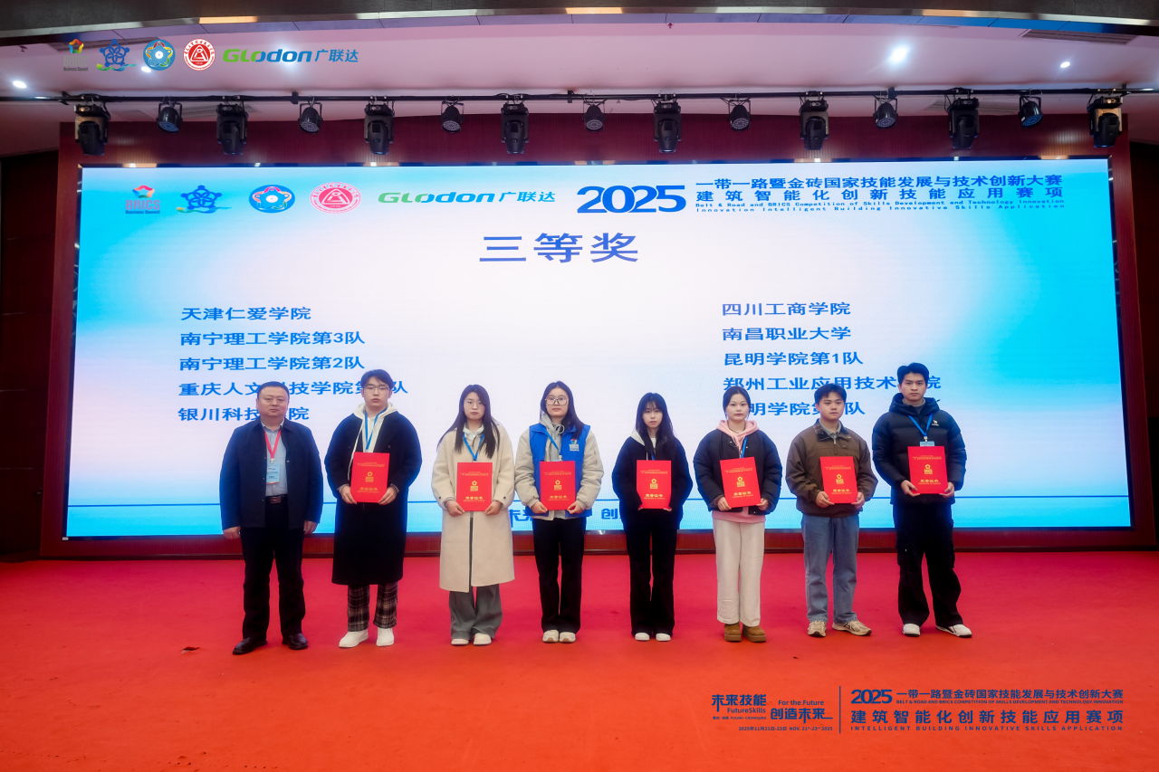 近日,备受瞩目的2025年“一带一路暨金砖国家技能发展与技术创新大赛”在全国赛场上圆满落幕。作为聚焦国际技能交流与技术创新的重要赛事,本次大赛吸引了来自全国各地高校的数百支精英队伍同台竞技,赛事规模与专业水准均创近年新高。在学校和鲁班智能建造产业学院组织下,南宁理工学院土木与工程学院学子历经校内选拔、全国模拟赛、全国选拔赛三大阶段的严苛淬炼,最终在决赛舞台上绽放光彩。由土木工程教研室教师团队全程悉心指导的两支学生代表队,在建筑智能化创新技能应用赛项中稳定发挥,双双斩获全国三等奖,为学校赢得了荣誉。