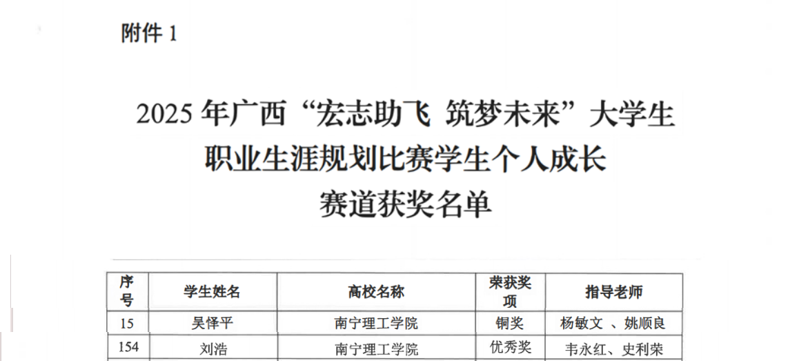 近日,2025年广西“宏志助飞 筑梦未来”大学生职业生涯规划比赛结果正式公布。我校两名学子表现优异,分别斩获铜奖与优秀奖。