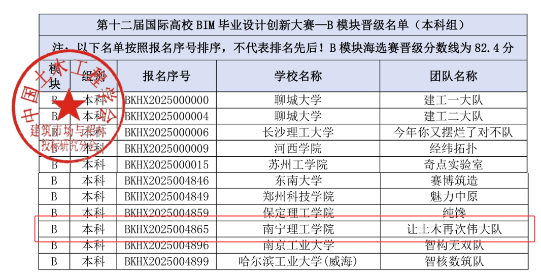 12月16日,第十二届国际高校 BIM 毕业设计创新大赛全国总决赛晋级名单正式公布。由南宁理工学院鲁班智能建造产业学院组织,土木与工程学院学生组成的“让土木再次伟大队”凭借过硬实力成功突围,斩获大赛 B 模块(建筑设计 AI+BIM 应用与创新)全国总决赛晋级资格。