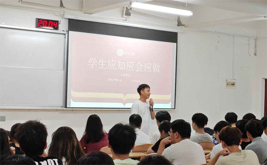 应知篇中,龙舒桦老师围绕学校的发展历程、办学条件和学院及专业设置等方面进行介绍,将学校名称、校训演变历史和深刻内涵娓娓道来。应会篇中,龙舒桦老师重点围绕学风建设的内涵、学校学风建设的主题词“尚礼、乐学、勤思、敏行”简述了学风建设的重要性。他强调加强学风建设是提高科研水平、建设创新型国家的必然要求,是提高人才培养质量、建设高等教育强国的必然要求,是引领社会风尚、建设社会主义核心价值体系的必然要求。应做篇中,龙舒桦老师对同学们提出了若干要求,一是强调课堂纪律,同学们应做到准时上课,严格落实“三带”,认真听课,做好笔记,杜绝随意说话、打瞌睡、吃东西和玩手机等行为;二是强调行为规范,自觉遵守校纪校规、自觉约束公共场所的自我行为;三是强调文明礼仪,同学们需自觉使用礼貌用语和体态语言,做到谈吐文雅和举止端庄;四是强调宿舍卫生,严格遵守宿舍管理规定,保持宿舍整洁,认真学习掌握《学生手册》相关内容。