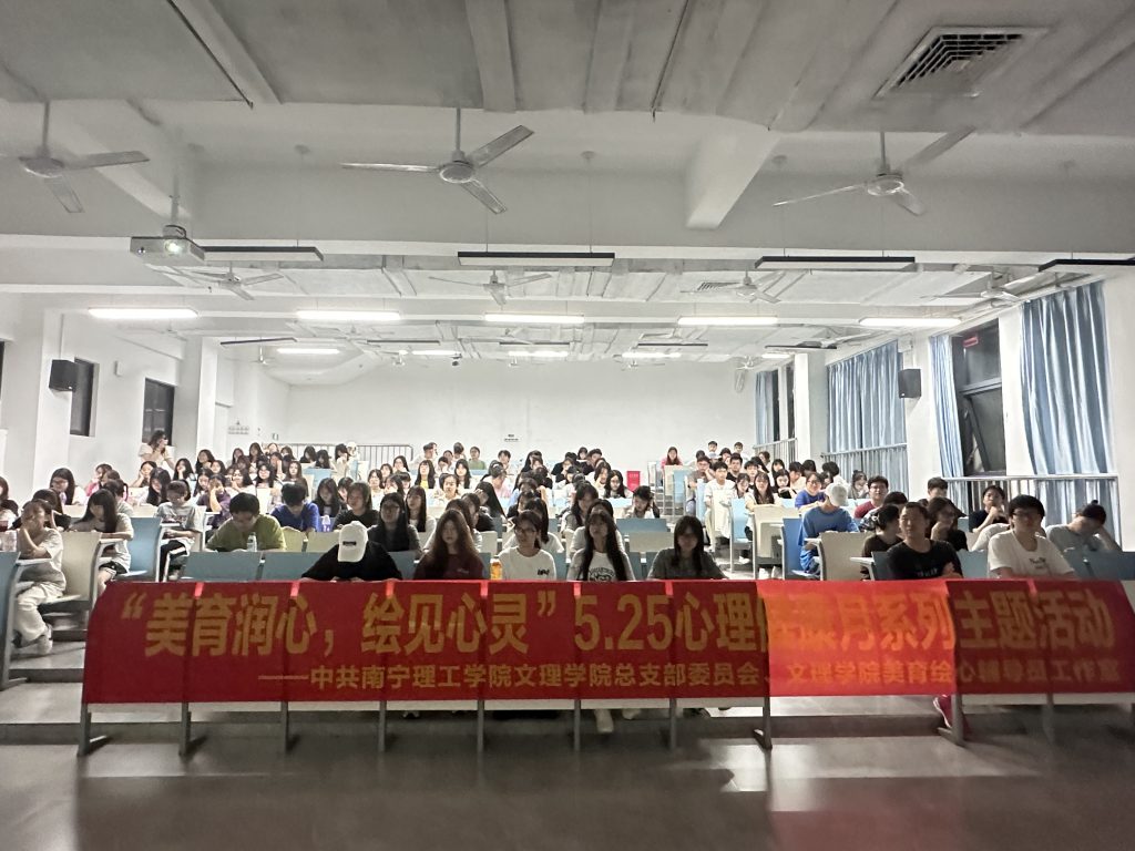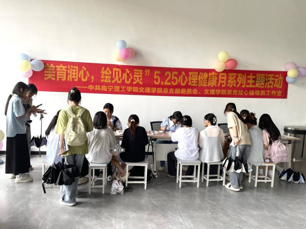 为进一步普及大学生心理健康教育知识,做好学生心理健康教育,全面提高学生心理素质,引导学生形成健康,乐观,积极的学习和生活态度,南宁理工学院文理学院美育绘心辅导员工作室于2024年5月20日至5月31日期间开展主题为“美育润心,绘见心灵”5.25大学生心理健康月系列主题活动。本次活动面向文理学生全体师生,活动形式多样化,活动参与人数达800余人次,取得良好的反响。