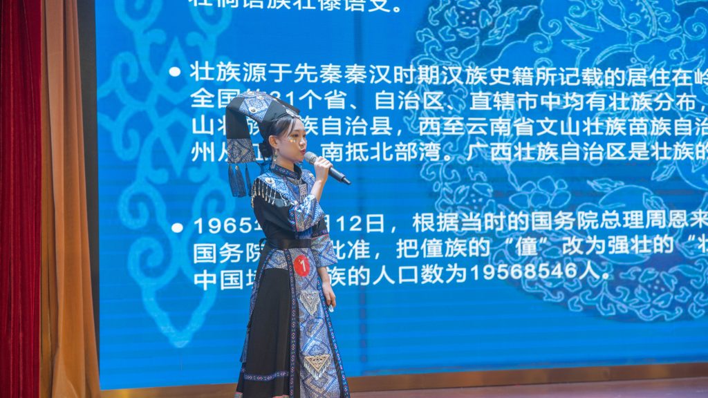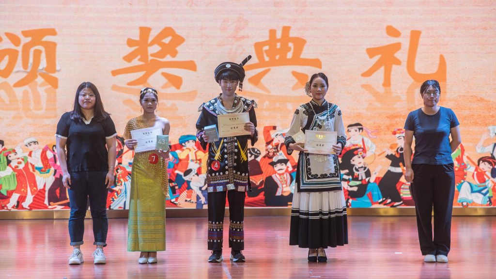 本次大赛共分为民族服饰走秀展示、介绍民族服饰文化两个环节。第一环节,各参赛选手通过抽签决定演出服饰和出场顺序以及搭档,首先进行模特单人服装走秀展示,其次进行模特双人搭档走秀,最后表演人员进行汇合走秀大展示;第二环节,是由参赛选手提前制作好PPT,根据抽签顺序依次上场,进行3分钟左右与自身所穿民族服饰有关的民族服饰文化演讲介绍。经过各位选手激烈的角逐,以及评委老师们的专业评审,大赛迎来赛果:王美君同学荣获一等奖;陈源乐、韦惠娟两位同学荣获二等奖;张晓妍、刘盈盈同学荣获三等奖。刘垭彬、古锡平、姚金灼三位同学荣获优秀奖。