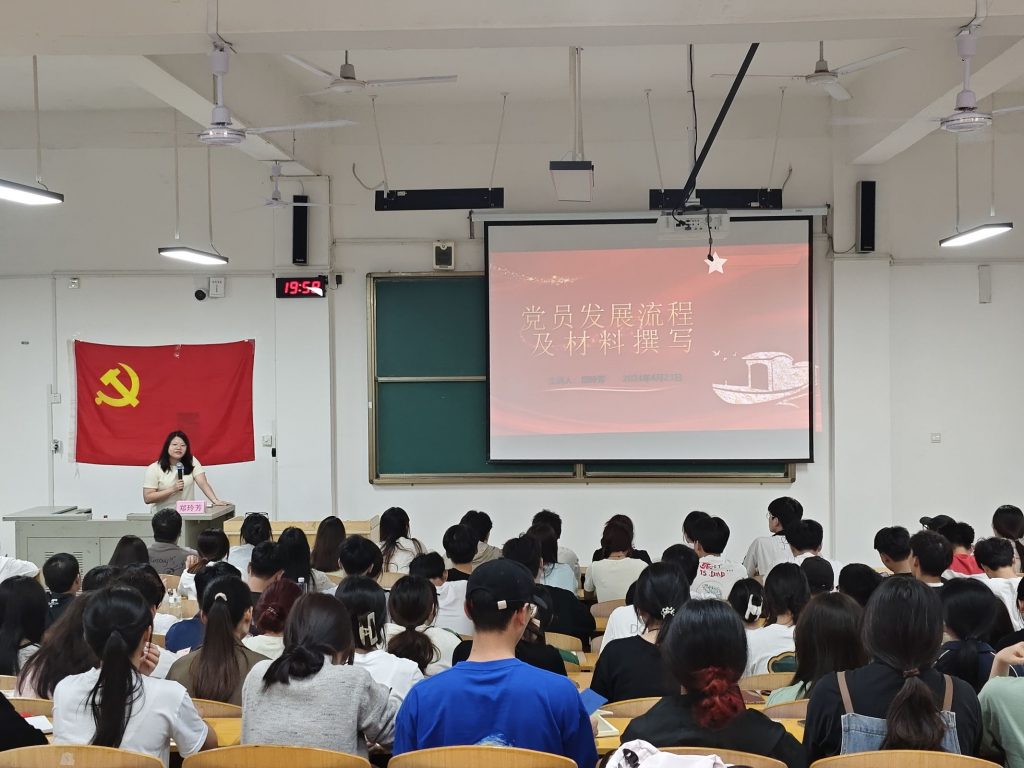 培训班第四堂课由郑玲芳老师主讲,她以《党员发展流程及材料撰写》为题,围绕入党积极分子到正式党员所需的流程、入党基本条件和入党申请书的书写、思想汇报的撰写等方面进行授课。