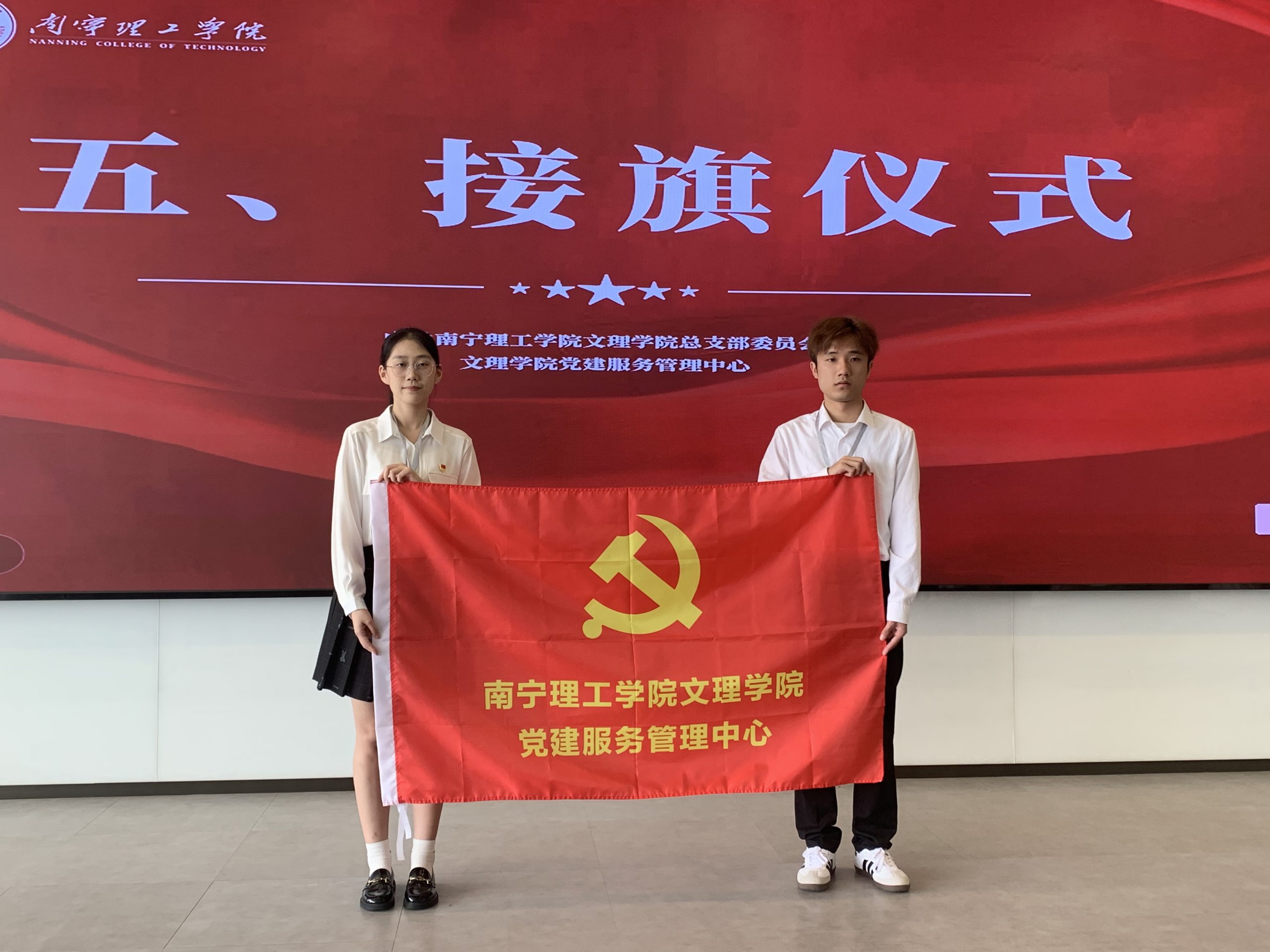 会议第七项,由学院党建组织员周秀欣宣读文理知行志愿服务队成立通知文件,紧接着,学院党总支书记助理覃学鹏向文理知行志愿服务队代表进行授旗,标志着文理知行志愿服务队正式成立。