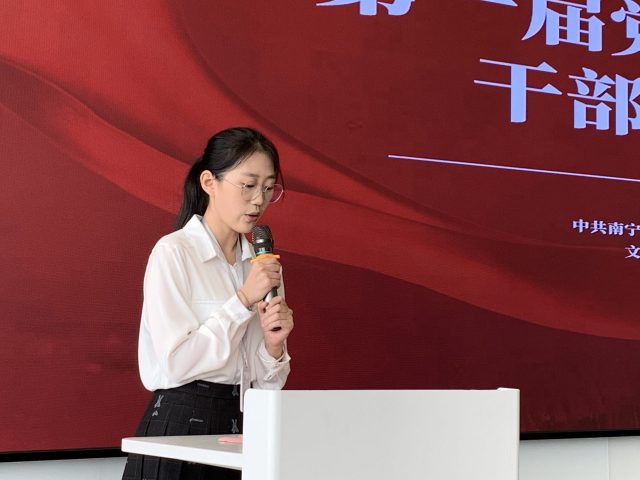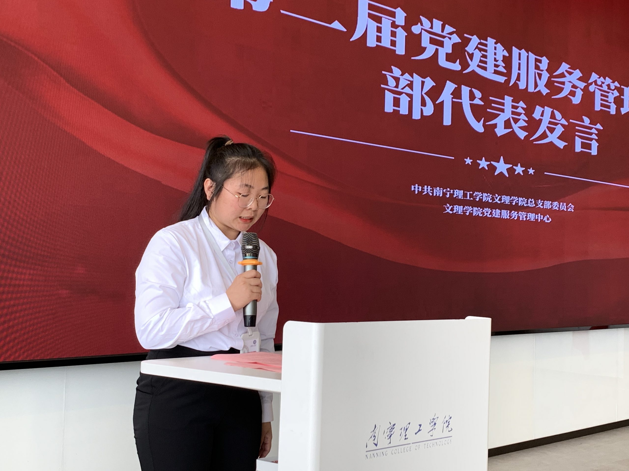 会议第五项,第二届文理学院党建服务管理中心干部代表裴真作表态发言。她说“珍惜韶华,奋发有为”。作为文理学院党建服务中心的一员,我们更应该珍惜时光,脚踏实地,发扬“螺丝钉”精神,用实际行动积极向党组织靠拢,同时我们站在新的历史起点,重任在肩,唯愿大家都能在文理学院党建服务管理中心一往无前、收获满满。