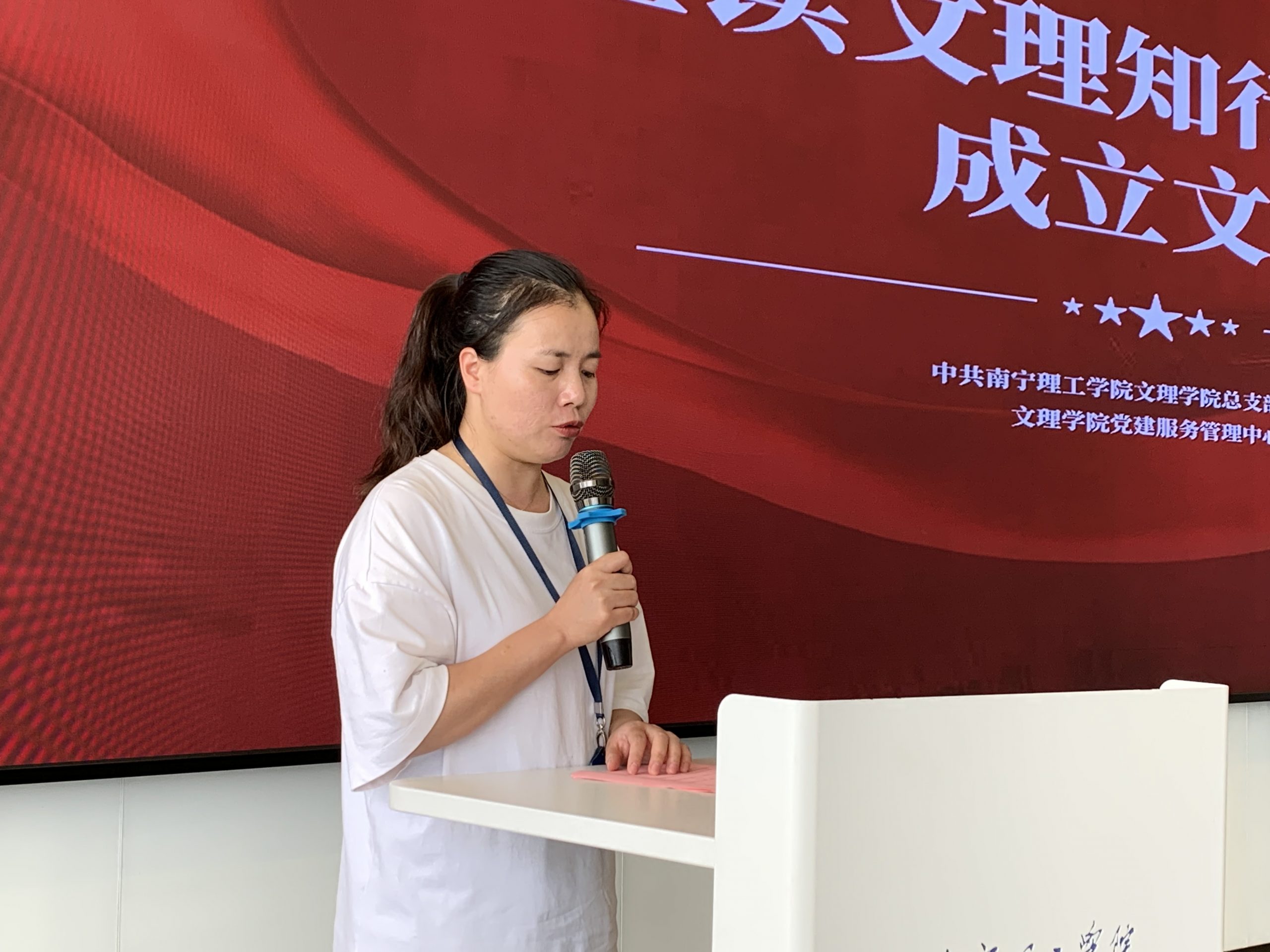 (文理学院党建组织员周秀欣宣读关于成立文理知行志愿服务队的通知文件)
