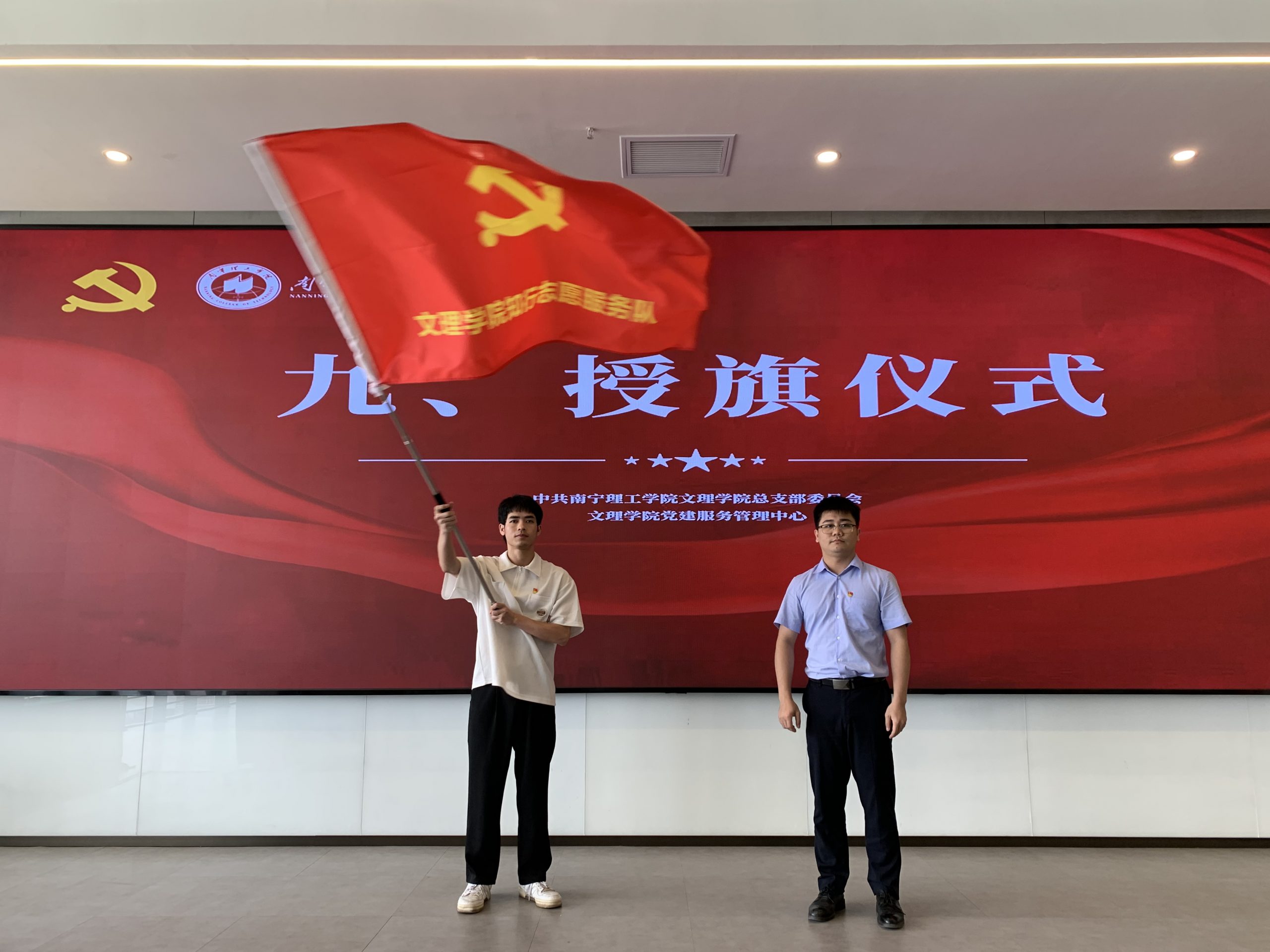 (文理学院党总支书记助理覃学鹏为知行志愿服务队代表授旗)