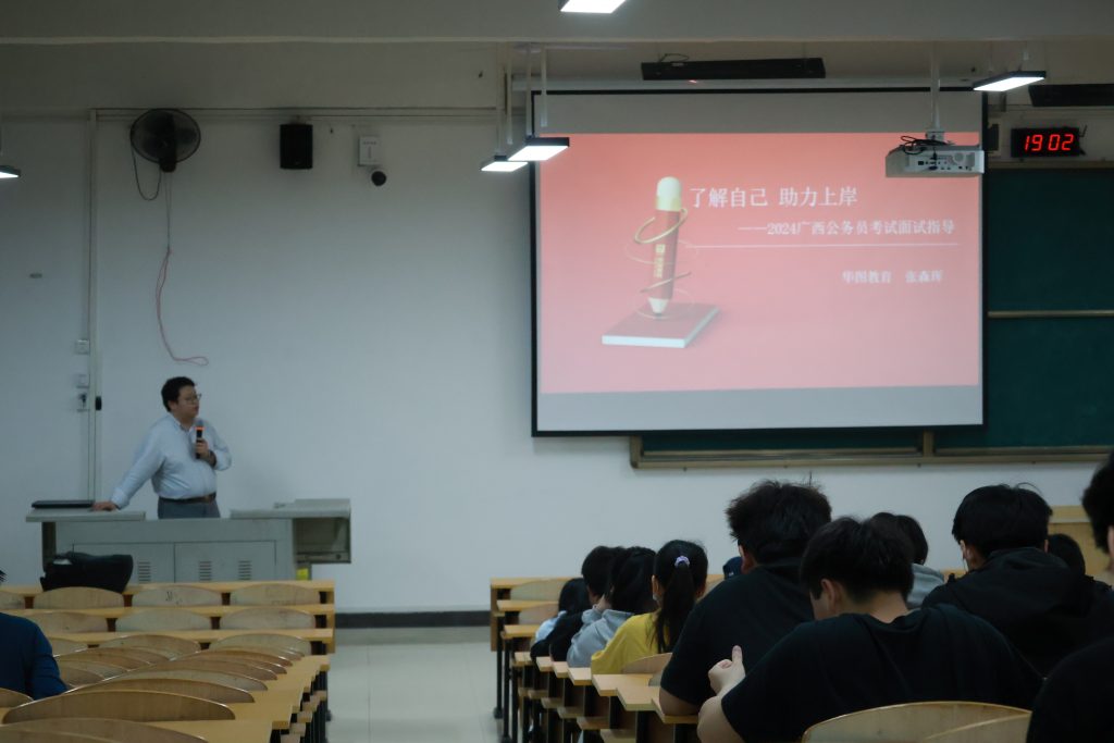 讲座伊始,老师详细介绍了考编的流程、考试内容以及如何制定科学合理的备考计划;接着,他以真题为例向同学们展示了各大题型的解题技巧;他提还到,考编过程充满挑战,考生需充分了解备考方法,要注意学习过程中坚持和毅力的重要性,鼓励考生们在备考过程中保持积极的心态,克服困难和挫折。最后,在互动环节中,针对考生们关心的问题,张森珲老师给予了详细的解答和建议。在场同学积极提问,与老师进行了深入的交流和探讨,现场气氛活跃,同学们纷纷表示受益匪浅。