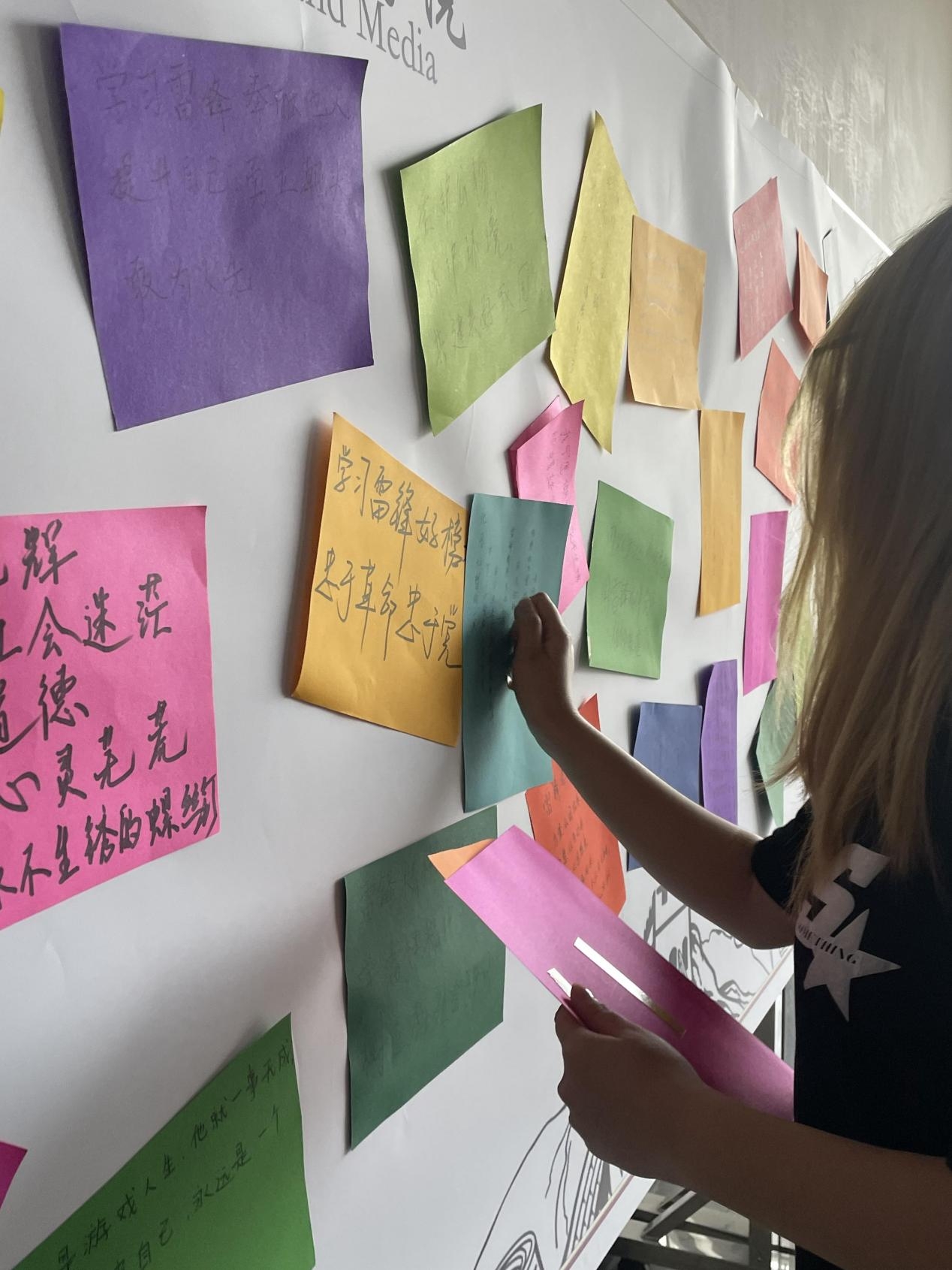 (同学们将做好的书法与绘画作品粘在6米1的展板处上)