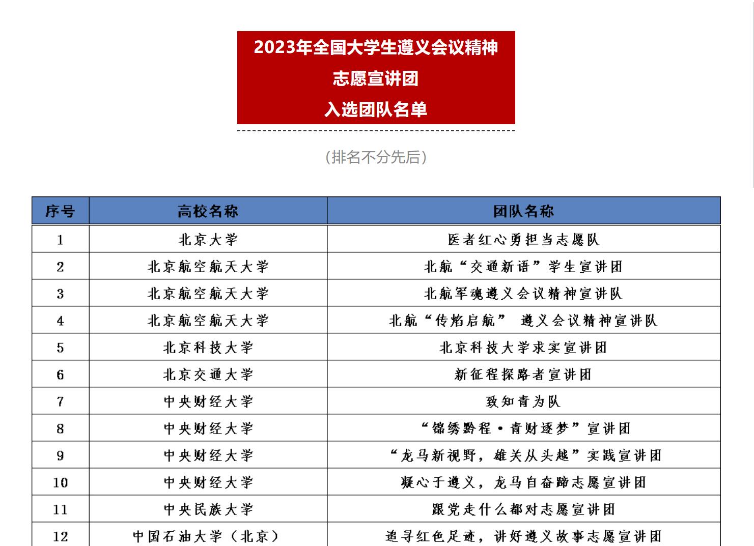 为全面学习贯彻党的二十大精神,深入贯彻落实习近平总书记提出的“传承红色基因、讲好遵义故事”的重要要求,引导青年学生弘扬遵义会议精神,赓续红色血脉,努力成长为担当民族复兴大任的时代新人。2023年9月,团中央青年志愿者行动指导中心、中共遵义市委、共青团贵州省委联合开展遵义会议精神志愿宣讲活动,面向全国高校遴选1000支大学生遵义会议精神志愿宣讲团。
