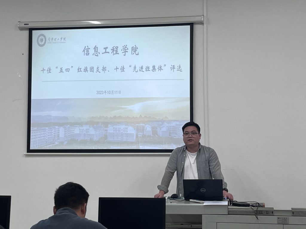 为进一步加强学院学风建设,充分发挥优秀班集体建设在学校教育中的重要作用,切实把立德树人作为教育的根本任务,有效提升学校内涵发展水平,2023年10月11日,信息工程学院组织开展了2022-2023学年十佳“五四红旗团支部”和十佳“先进班集体”评选活动。出席评选的评委有信息工程学院分团委书记王辉及我院全体辅导员。