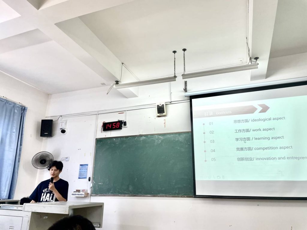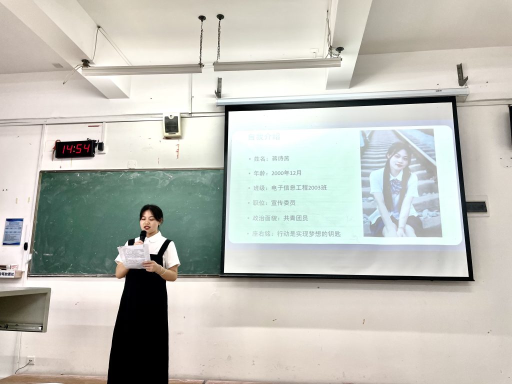 按照抽签顺序,电信2003班蒋诗燕、计算机2003班林作潮、计算机2104班孙选聪、电信2101班黄惠宇、计算机2202班王笠、网络2001班李檬、通信2001班李博宇、电气2003班刘振洋、电气2102班孟奥伟、电信2001班邵超彪、通信2101班宋昌林、计算机2102班何华鸿12位候选人依次上台答辩,他们根分别从思想情况、学业成绩、科研创新能力、专业素养、社会实践、获奖情况等方面进行展示。