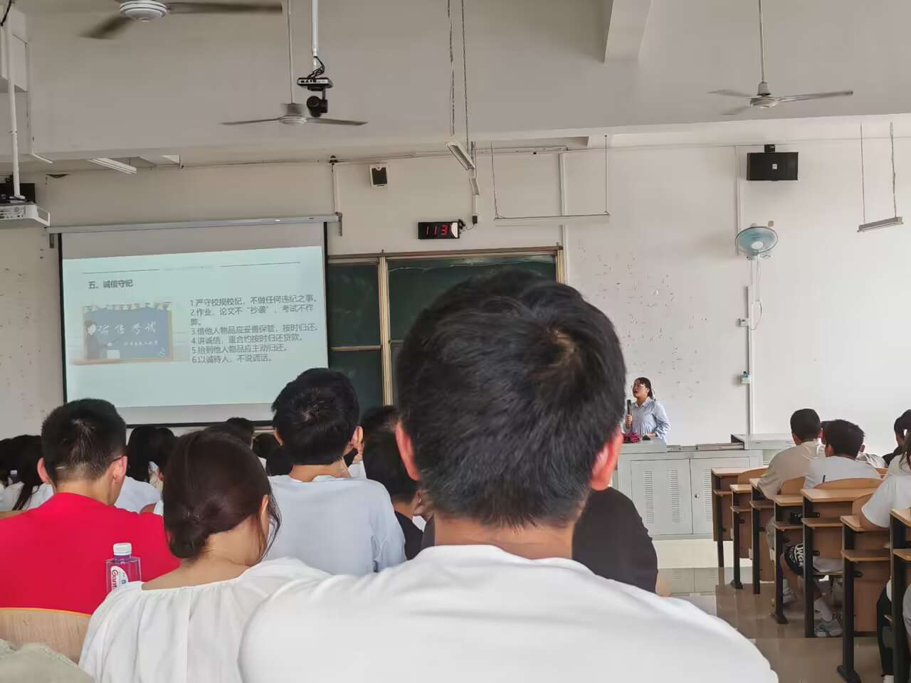 专题组老师教育引导新生树立宪法至上的法治观念、增强规则意识、学会尊重和保障他人的权利,自觉维护自身的权利,以法律为武器自觉与任何侵权和不法行为做斗争。引导新生学廉倡廉,筑牢思想防线,共同维护校园清风。