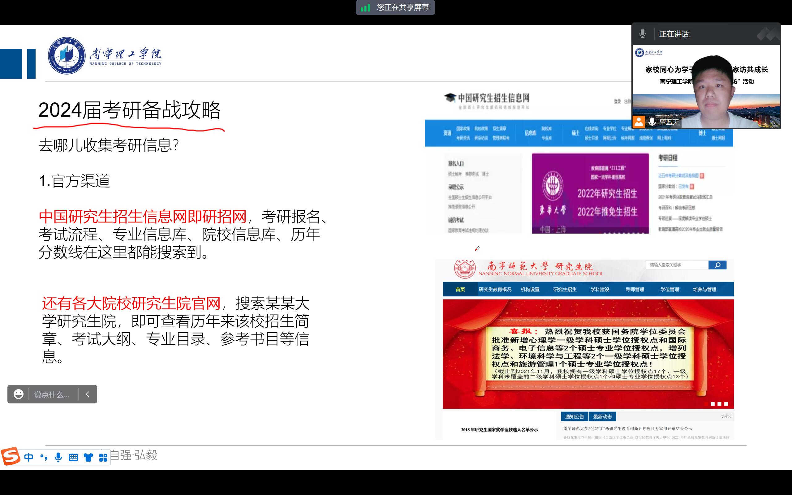 云·家访活动上,各年级辅导员作了针对家长及学生的假期注意事项、防范溺水、电信诈骗、社会实践等安全要点提示;同时针对不同年级、不同专业特点,建议学生及家长做好学业生涯规划,抓住综合能力提升关键期,高年级辅导员积极开展学生就业指导,通过对比国内考研海外升学相同点及不同点,并开展国际化教育宣传,对2024届毕业生就实习就业等方面进行了指导,最后全面梳理就业备考时间轴与考研、求职就业要点。“云·家访”最后,辅导员们对与会家长所关心的共性问题进行答疑,针对不同学生的个性问题进行了针对性的沟通交流。