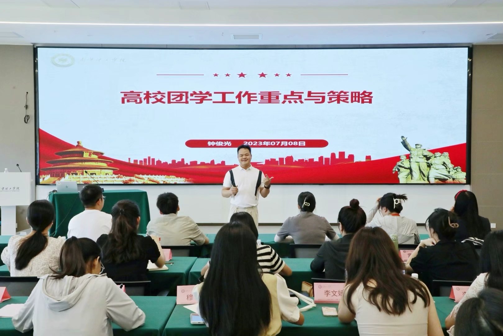 共青团工作是高校党的建设和思想政治工作的重要组成部分,为进一步推进团学工作,7月8日下午,培训班第七讲课程邀请我校团委书记钟俊光为培训班全体辅导员做了题为高校团学工作重点及策略专题课程。