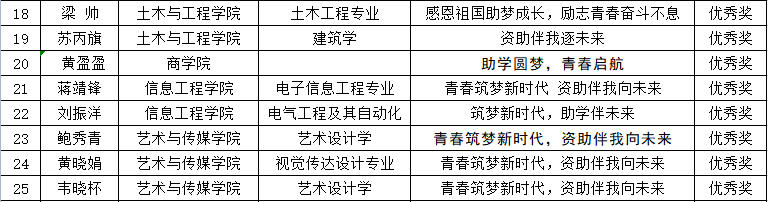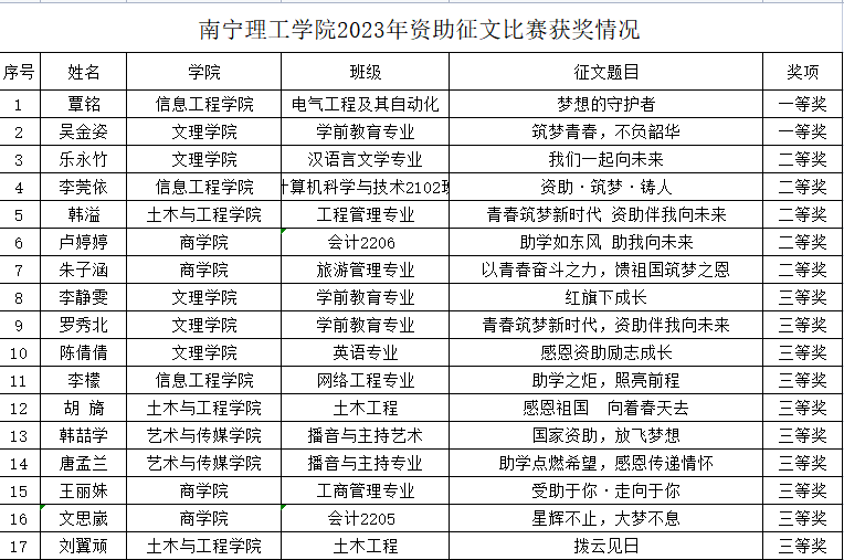 参赛学生结合自身实际,通过征文,展示了自己在国家资助政策的支持下,爱党爱国,坚持梦想,砥砺奋斗,为实现现代化强国贡献自己青春和力量的精神风貌。经学院初评,校级终评,最终信息工程学院覃铭同学的征文作品《梦想的守护者》及文理学院吴金姿同学的征文作品《筑梦青春,不负韶华》荣获征文比赛一等奖;文理学院乐永竹等5名同学荣获二等奖;艺术与传媒学院韩喆学等10名同学荣获三等奖;土木与工程学院梁帅等8名同学荣获优秀奖。