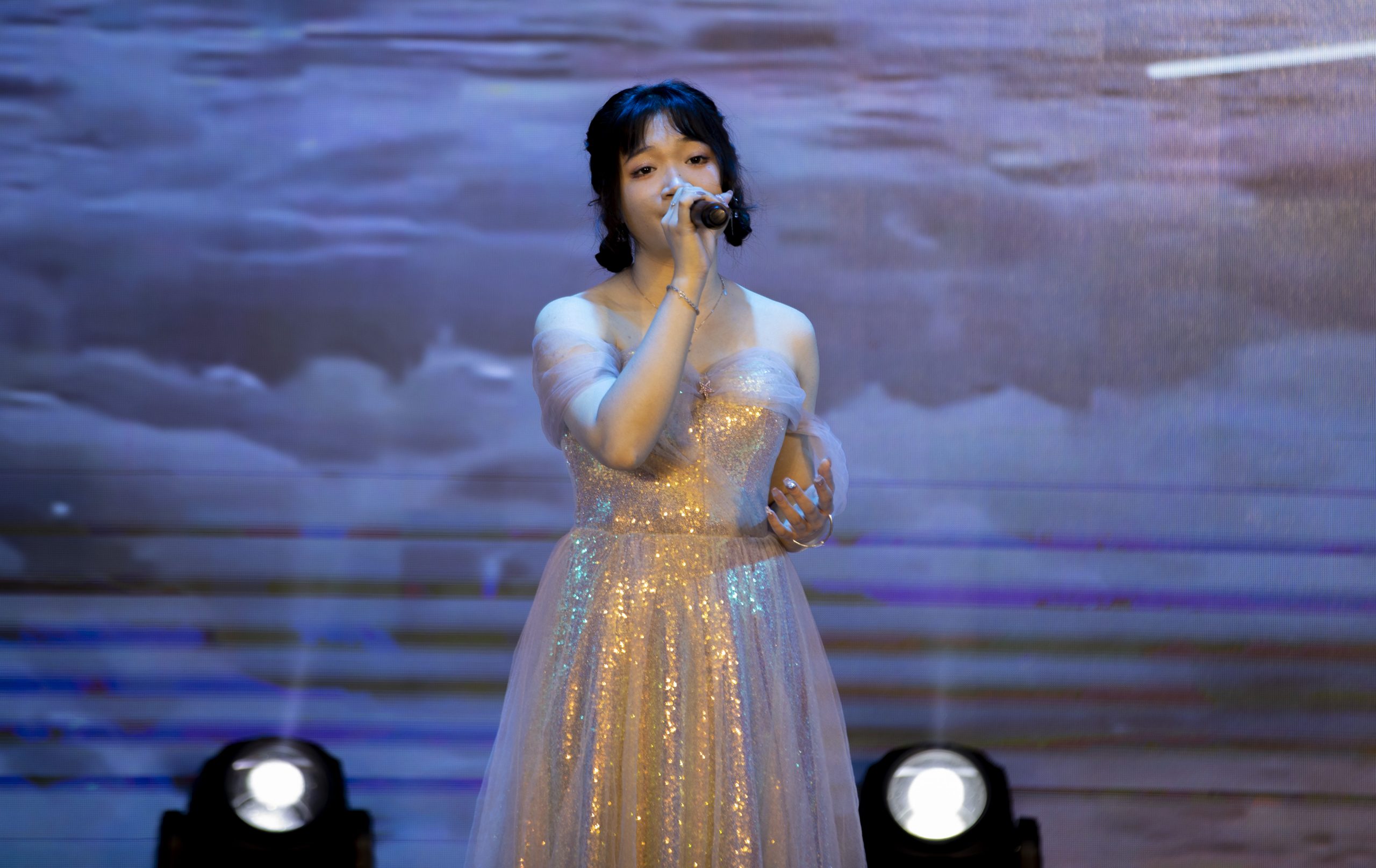 祁望同学为我们带来了歌曲《我》。她的歌声空灵动人,穿透力、感染力极强。情感的洪流随她的歌声奔涌而来,掌声与欢呼声相映着歌声盘旋在整个舞台之上。