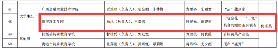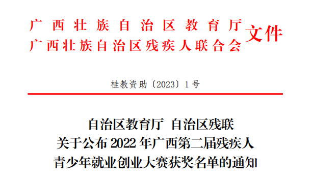 为加快推进残疾人青少年职业教育工作,促进残疾人青少年更好就业创业,202212月自治区教育厅和自治区残联组织开展了“聚爱青春 助残筑梦”广西2022第二届残疾人青少年就业大赛。我校学子杨风、王嘉伟及其创业项目《一包金花——“三低”药食同源奶茶引领者》荣获大学生组优秀奖,我校教师钟俊光、谢警黎荣获优秀指导老师荣誉称号。