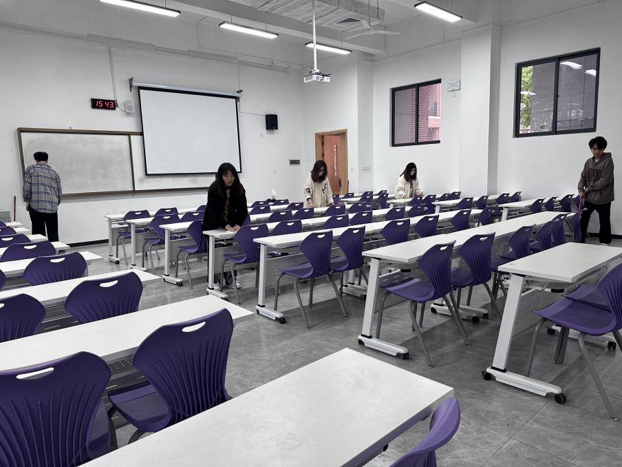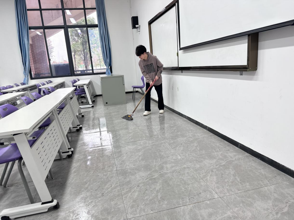 同学们全面打扫教室的各处区域:黑板、讲台、桌面、地面等,对教室桌椅摆放整齐,在大家的共同努力下,教室焕然一新。