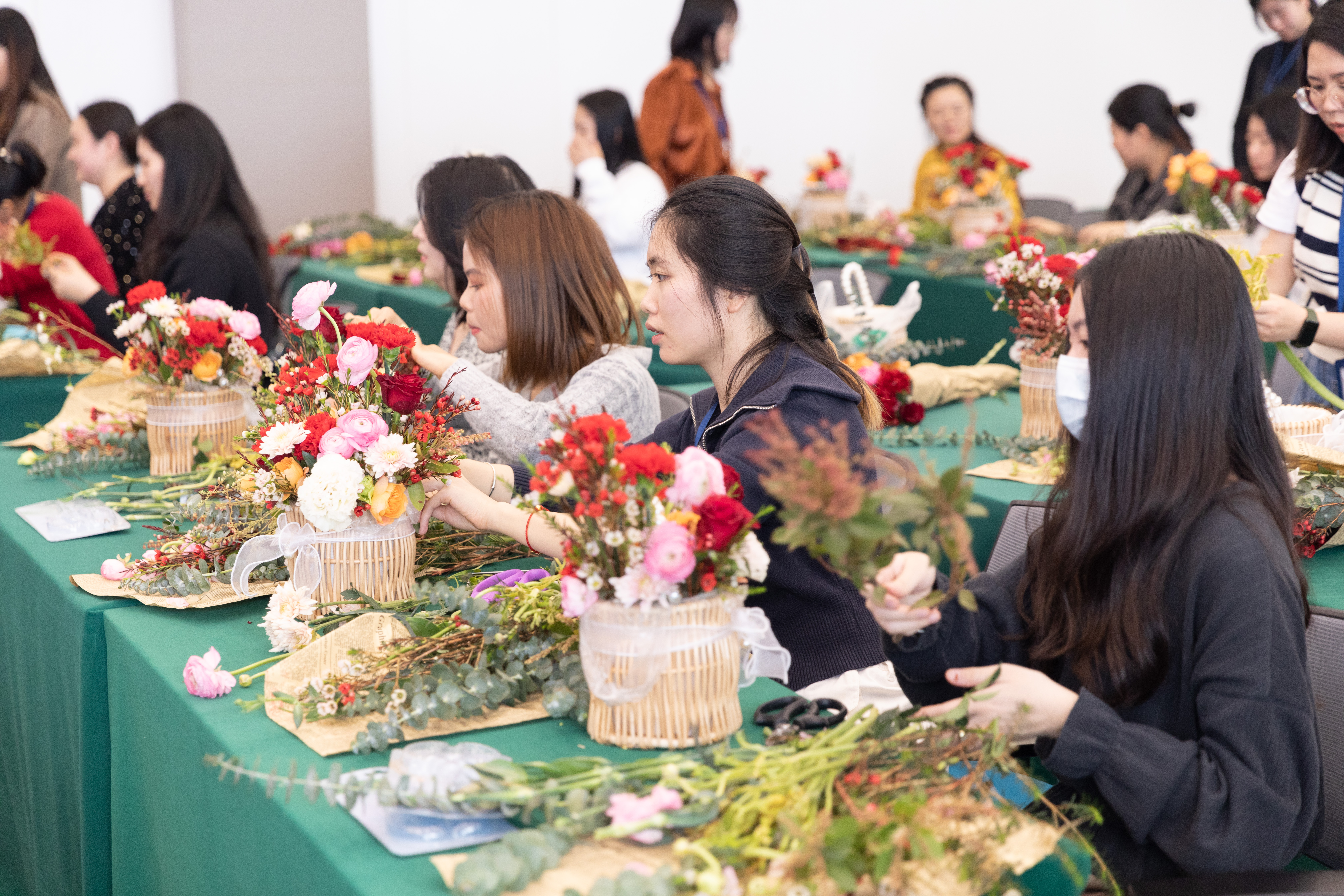 活动现场弥漫着芬芳花香,洋溢着欢声笑语。花艺老师用通俗易懂的语言讲授插花的要素、技巧等基本知识,随后,在花艺老师带领下认识各种花卉,活动氛围轻松热烈,大家充分发挥创造力和想象力,在花艺老师的悉心指导下,大家用自己灵巧的双手,将原本普普通通的花材,创造出了造型别致、颜色艳丽、搭配各异的插花作品,充分展现了大家对美的理解、对插花艺术的感受和对幸福生活的感悟。