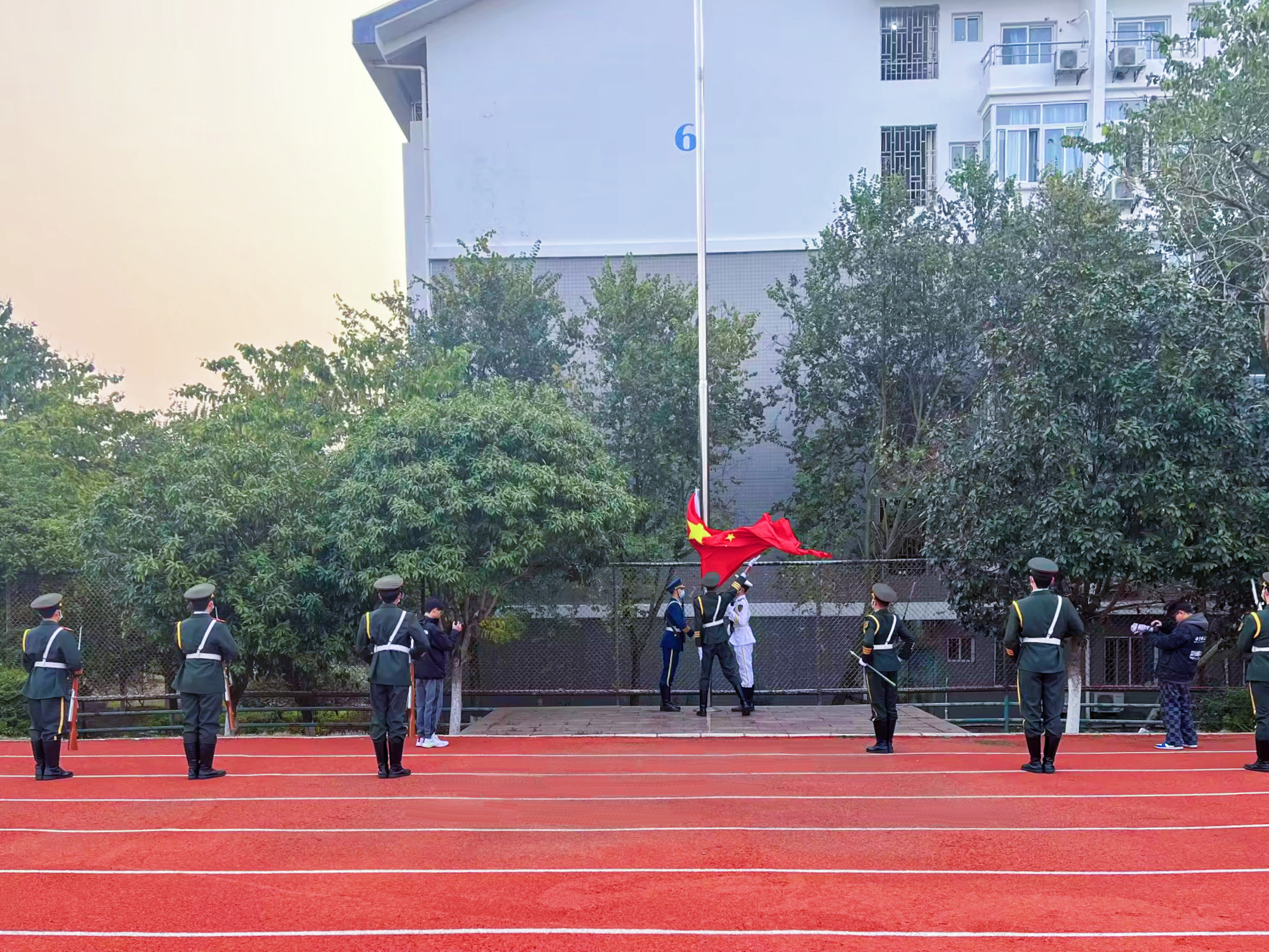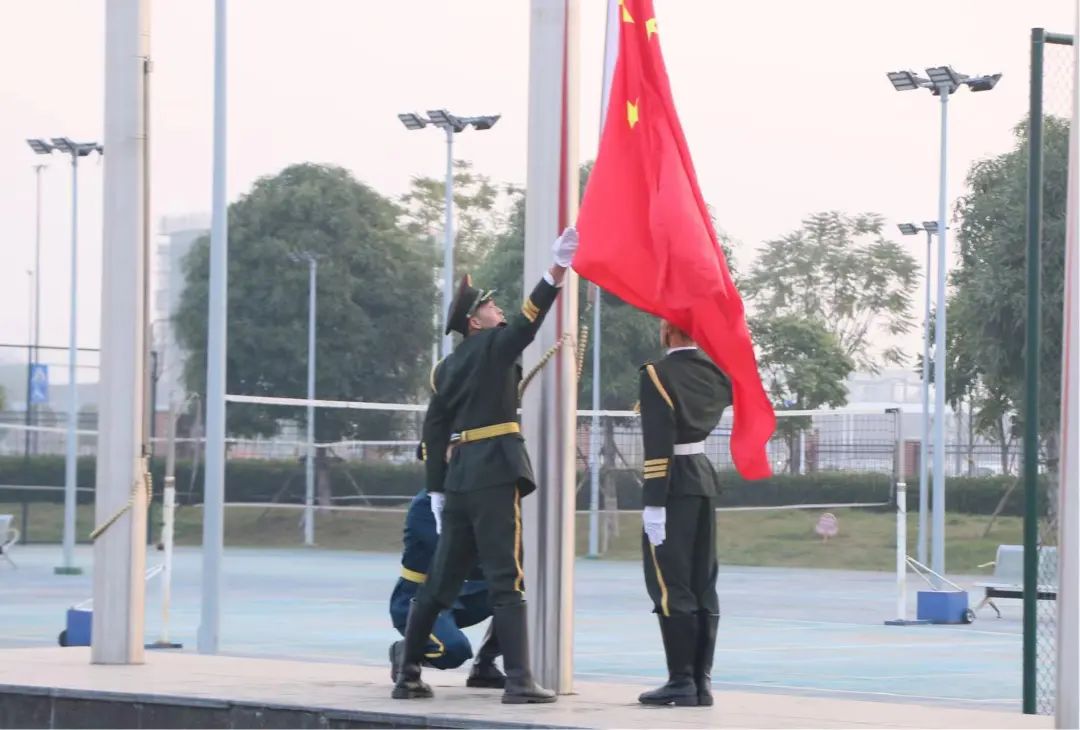 伴着新学期第一缕晨光,升旗仪式正式开始,国旗班护卫队队员护送着鲜艳的五星红旗,他们目光如炬,队列整齐,步履铿锵,在庄严的国歌声中,五星红旗冉冉升起,伴随着雄壮嘹亮的国歌声,全体人员肃然而立,向五星红旗行注目礼,齐唱国歌,表达对伟大祖国的无限敬意和热爱。