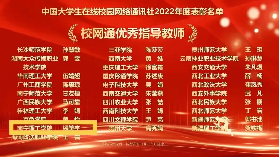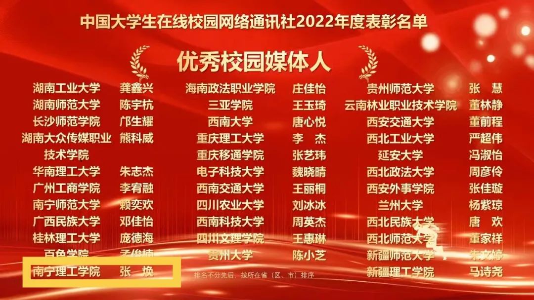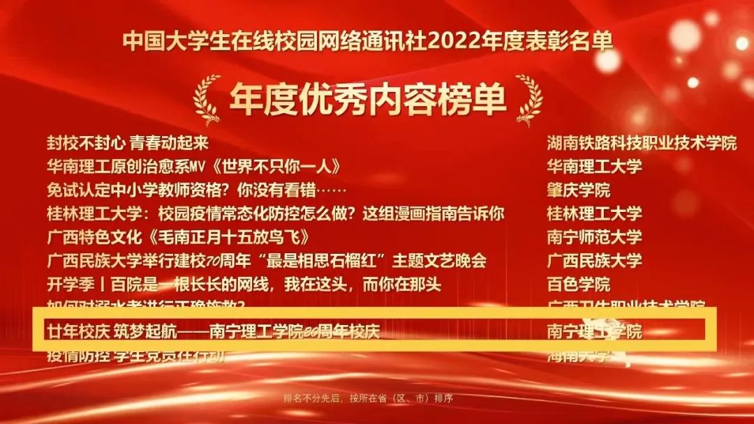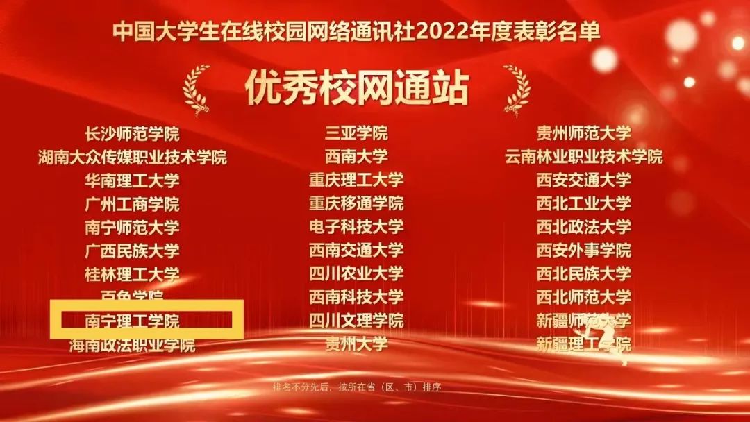 1月10日,中国大学生在线2022校园号建设暨校网通工作年会召开。会议揭晓了中国大学生在线校网通及校园行活动2022年度表彰名单。南宁理工学院荣获“优秀校网通站”,南宁理工学院学生工作部荣获“2022年校园行优秀组织奖”,南宁理工学院学生工作部老师杨笑宇老师荣获“校网通优秀指导教师”,《廿年校庆 筑梦起航一-南宁理工学院20周年校庆》荣获“年度优秀内容榜单”,信息工程学院2020级学生张焕荣获“优秀校园媒体人”。