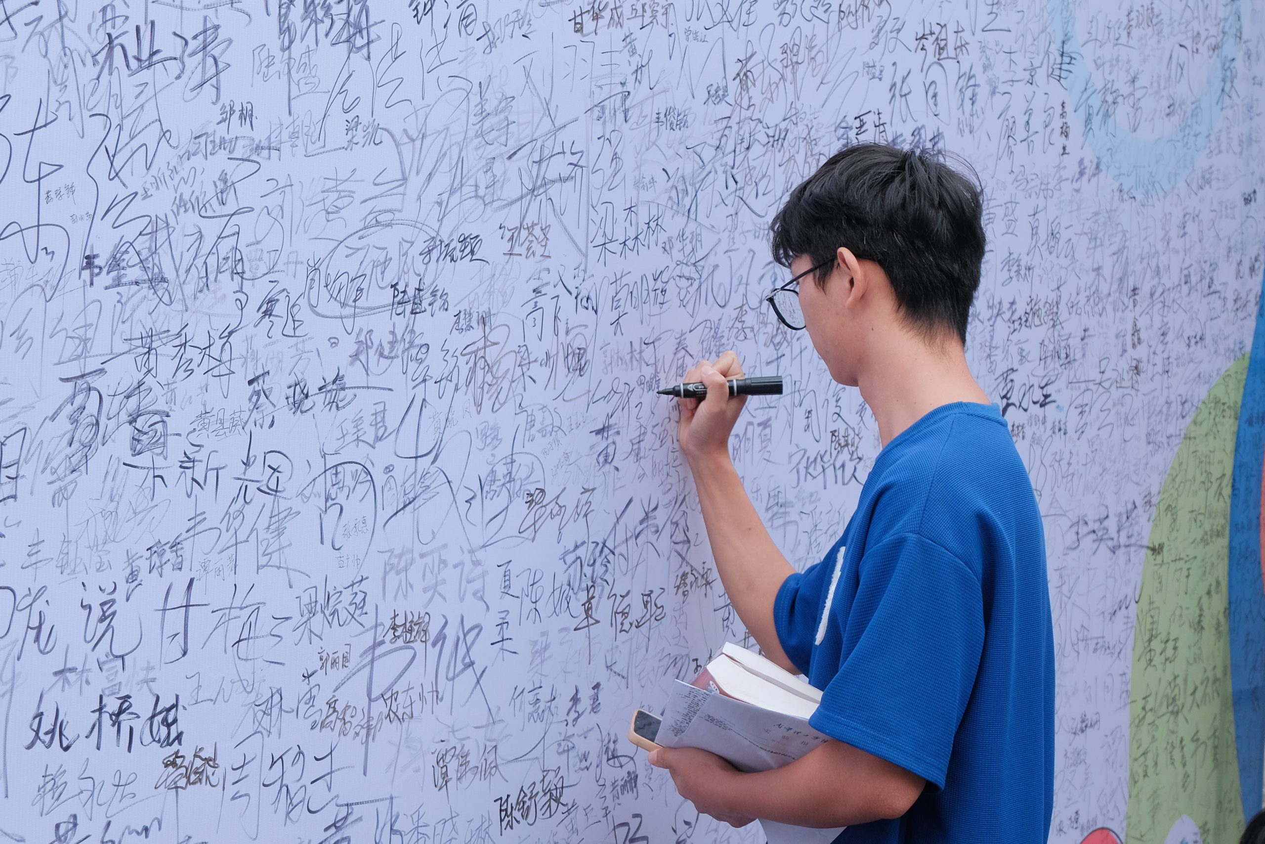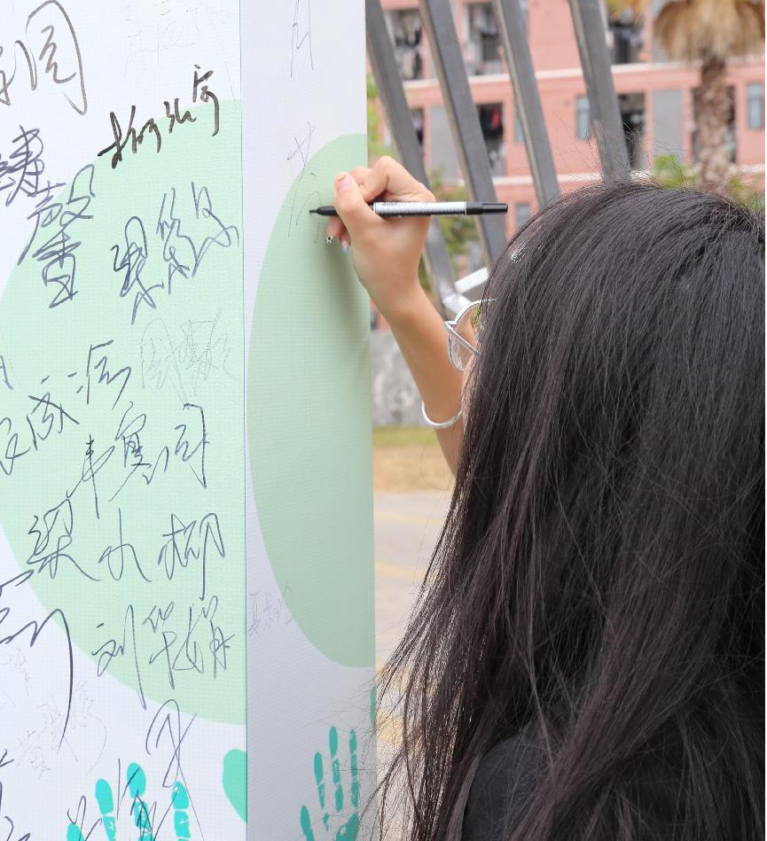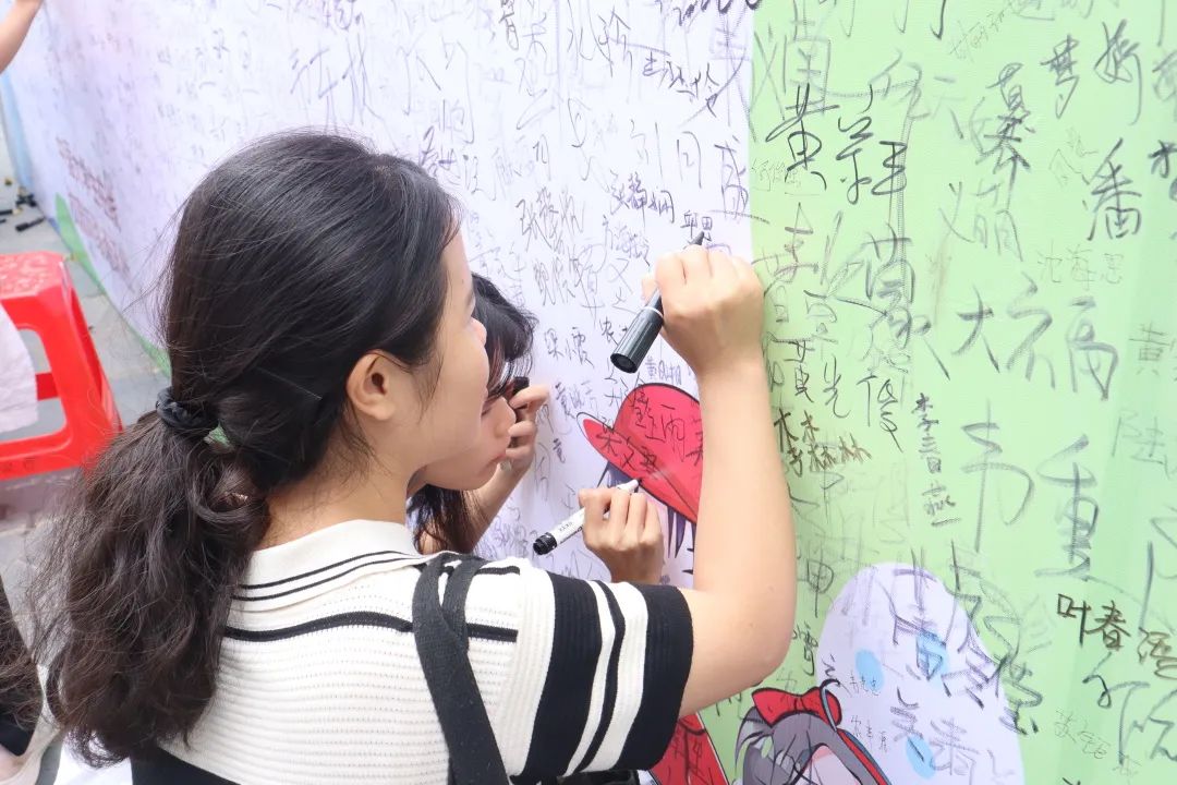 (在签名墙上签名)