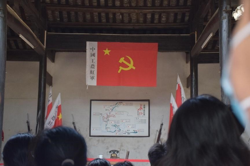 参观红军堂——接下来步入的是红军堂,在红军长征时,两个中央纵队就是从这里通过浮桥渡过湘江的。“三官堂”是当年朱德、彭德怀指挥红军突破敌人第四道封锁线——湘江战役指挥所旧址,又是红军在门前架设浮桥渡河的主道。当地人为表示对红军的怀念,把其改名为“红军堂”。