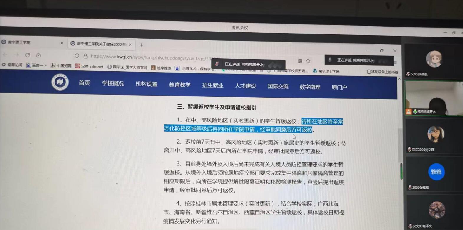 各年级辅导员老师围绕自治区、学校的疫情防控相关规定,重点强调了“小北平台”每日健康上报,凭绿色健康码、行程码及48小时内核酸检测阴性证明可返回校园;有中高风险地区及境外返回的同学暂缓返校,根据所属地要求居家监测,未接到学校开学通知切勿提前返校;同时辅导员们强调了返邕返校人身安全、财物安全、交通安全、反诈骗教育等方面为学生进行了详细的讲解,通过案例剖析讲解、经验总结梳理。