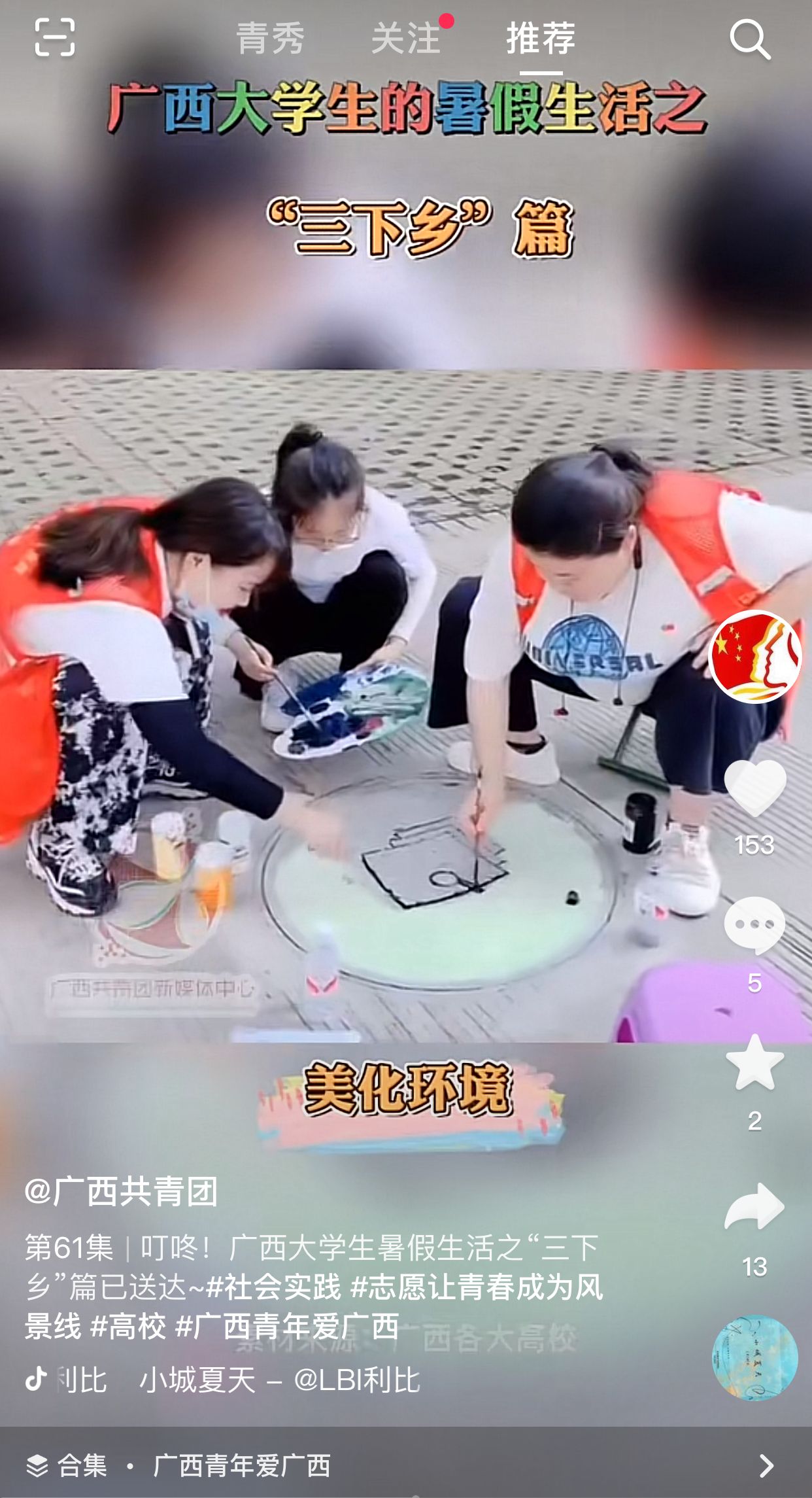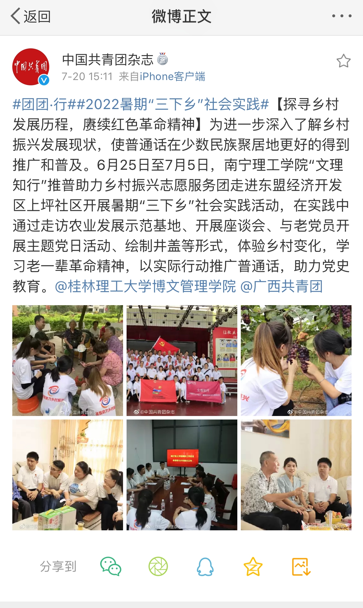 为积极响应2022年全国大中专学生志愿者“三下乡”暑期社会实践,我院成立“文理知行”、“文理行知”、“走进仫佬,你我同行”实践队”等暑期社会实践团队,社会实践团深入南宁市东盟经济开发区、桂林市雁山区大田村、罗城仫佬族自治县开展乡村振兴、文化传承、义务支教等多形式的社会实践,对此中国青年网、中国共青团杂志微博、广西共青团抖音号多家权威媒体进行了报道。