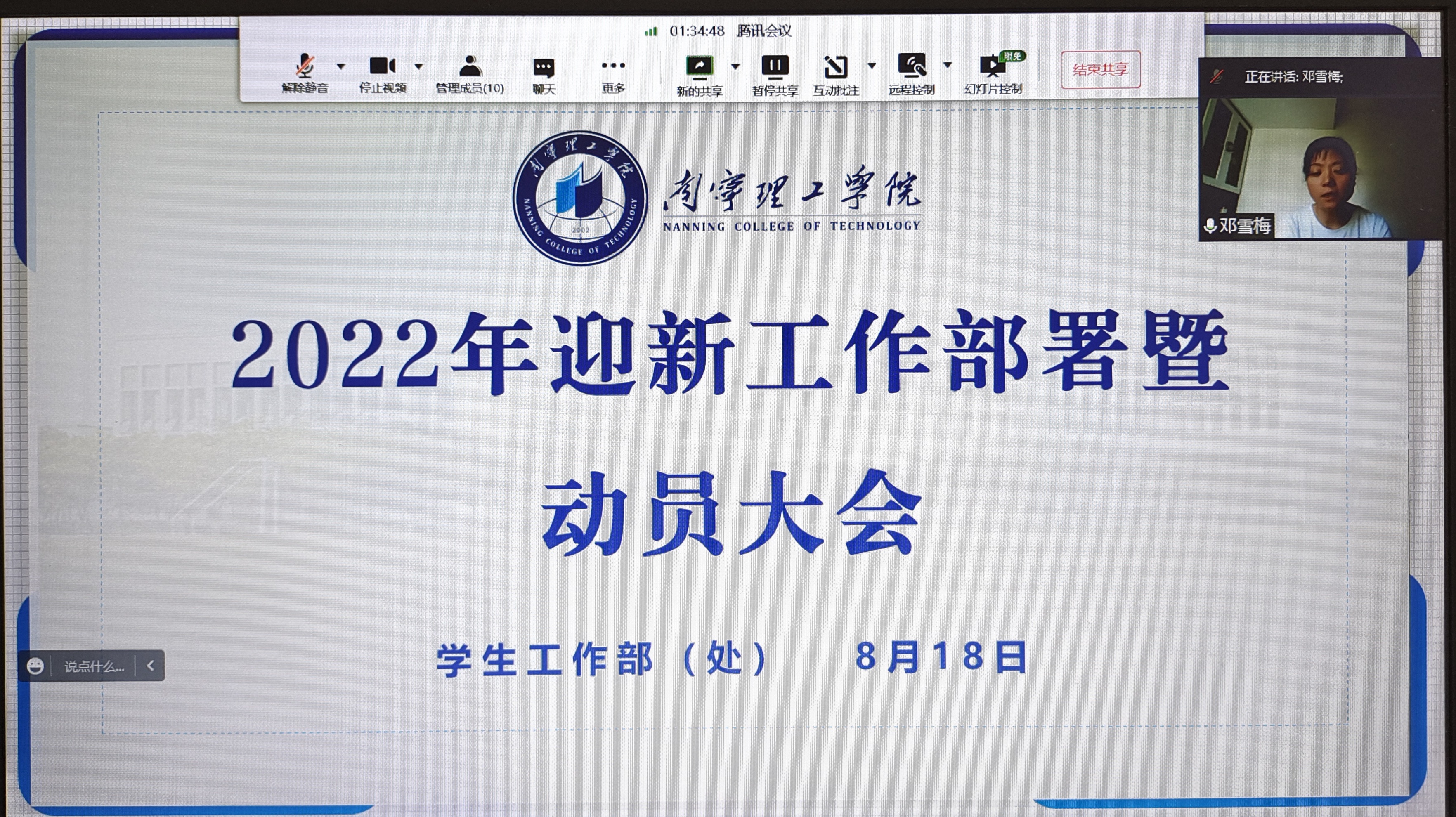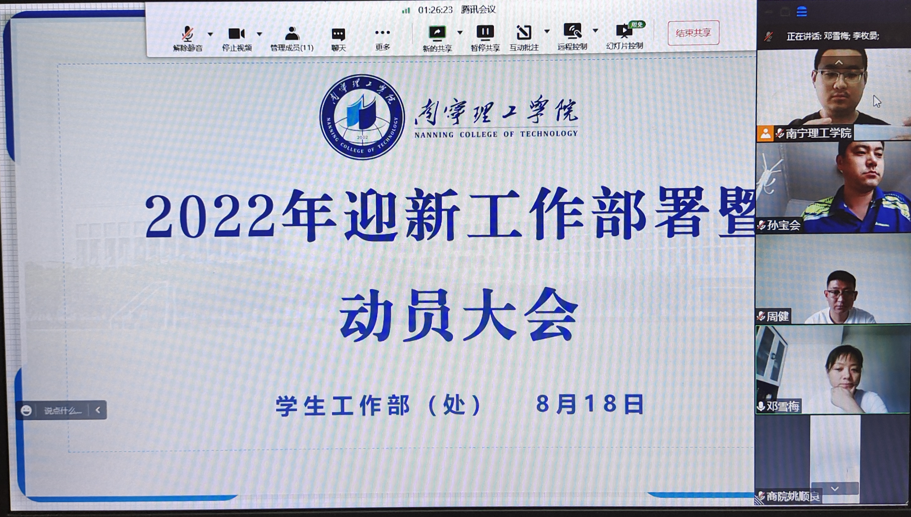 8月18日上午,我校学工系统在线上组织召开2022年迎新工作部署暨动员大会,学校党委副书记邓雪梅出席会议,学生工作部(处)、学生事务部、校团委主要负责人及各二级学院党总支书记参加。会议由学生工作部(处)部(处)长李枚晏主持。