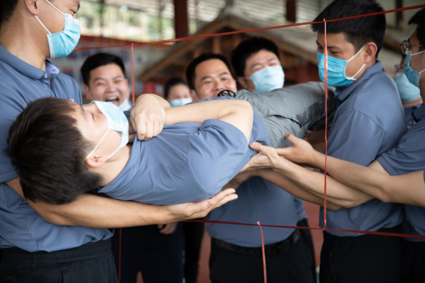 活动在热身活动中逐项展开。随后教练员组织四个队伍选出队长和队名,制作队旗、队歌,创造小队造型,并一一展示。达芬奇密码、信任背摔、旱地冰壶、人造战车、穿越电网等项目纷纷上演,各组学员们热情投入,每一位学员都有精彩的表现。每位学员都能够在活动中团结协作,收获成长,融合所学与所为。
