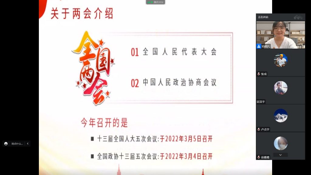 为充分深入学习全国两会精神,落实会议决策部署,引导师生党员深刻领会、准确把握“两会”的精神实质。我院学生第一党支部于2022年3月16日开展“聚焦全国两会,牢记使命担当”主题党课。本次党课采取线上会议的形式展开,由支部书记邓超凡主持,支部全体党员参加。