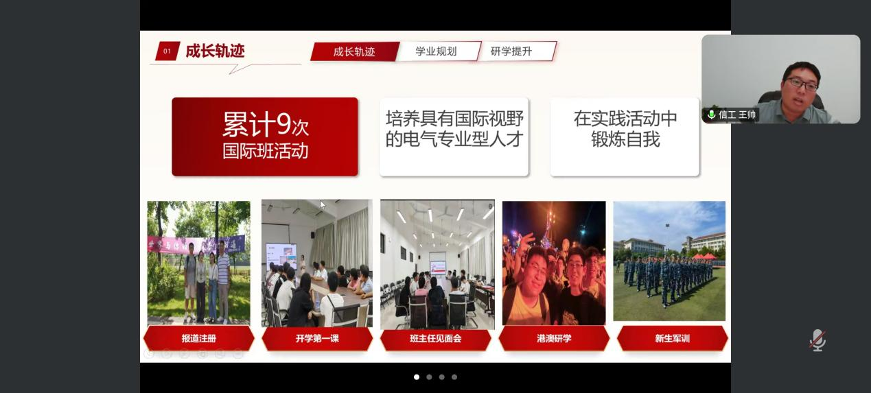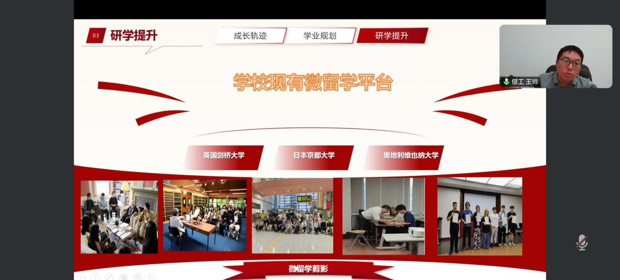 随后,王帅书记聚焦“学业规划”与“研学提升”两大核心板块展开详细讲解。在学业规划方面,他以学院优秀毕业生黄理“微留学—斩获多国名校Offer—跨国职场发展”的成长路径为典型案例,结合南理本硕直通学子收到的海外高校录取通知实例,直观解析海外升学的核心要求与准备方向;在研学提升方面,他重点介绍学校搭建的微留学平台,包括与英国剑桥大学、日本京都大学、奥地利维也纳大学等世界知名高校合作的课程,深入说明微留学对提升学生跨文化沟通能力、夯实长期留学基础的重要作用。同时,王帅书记还简要解读《智能信息国际班考核评定表》中的8项综合评价指标(涵盖学业成绩、语言成绩、科技学术竞赛、创新创业训练计划、境外学习交流等),让家长清晰掌握国际班的培养重点与评价标准。