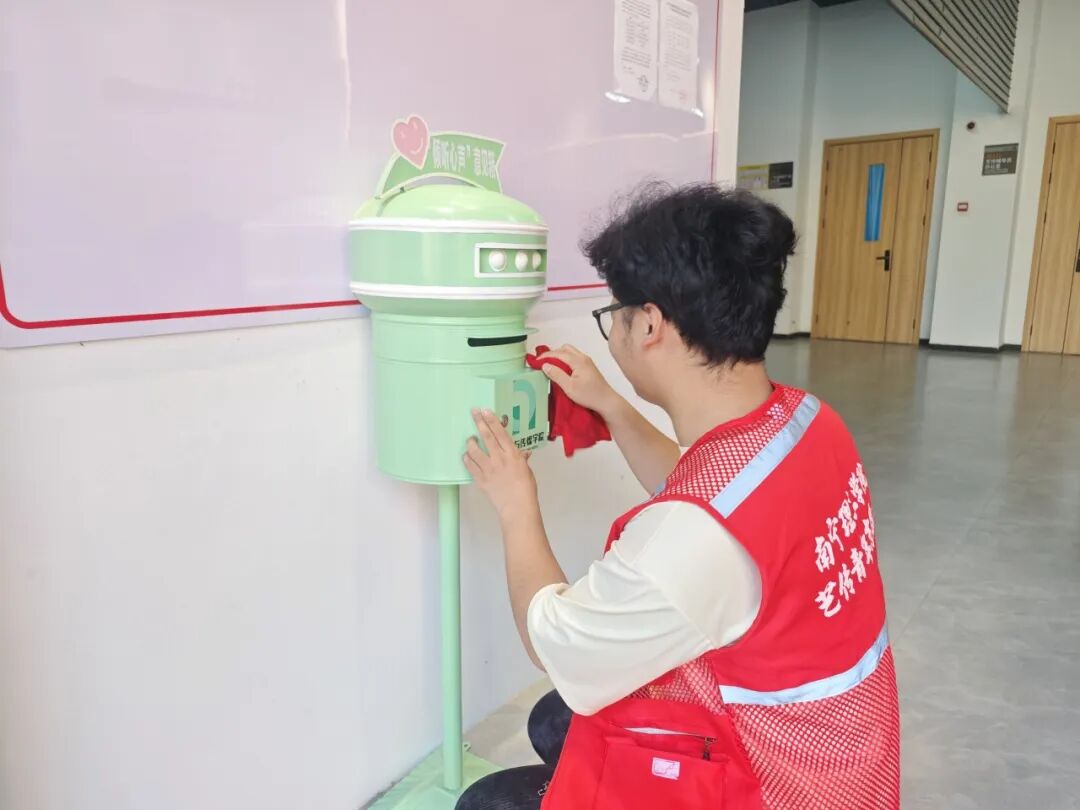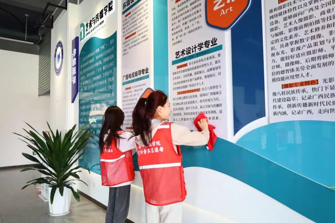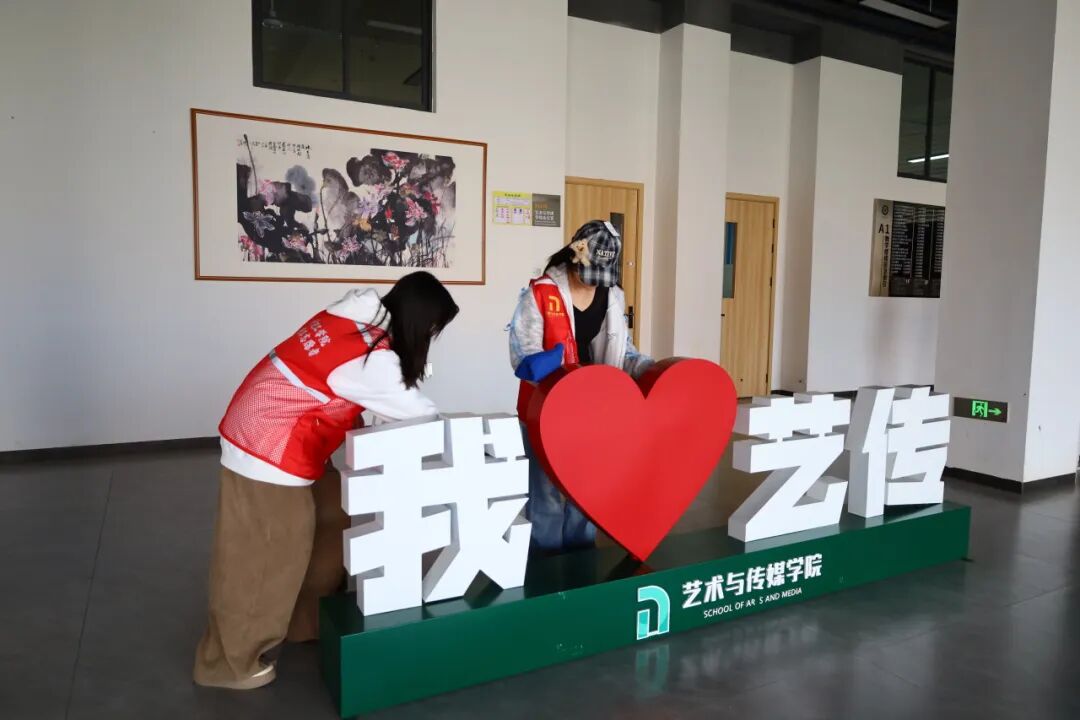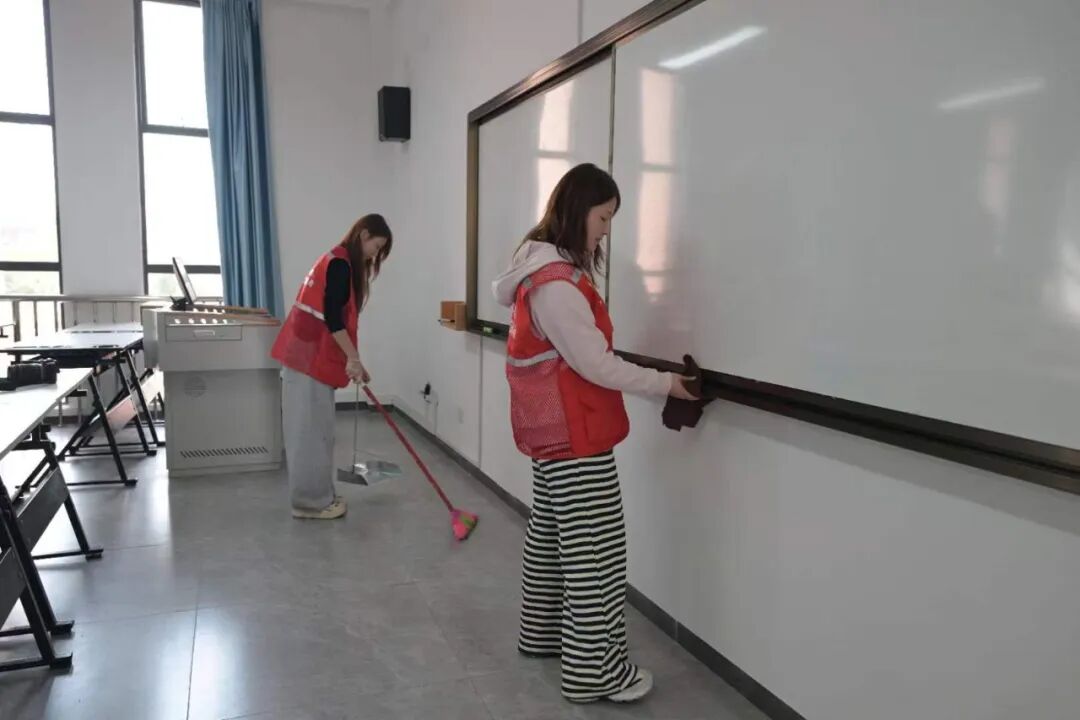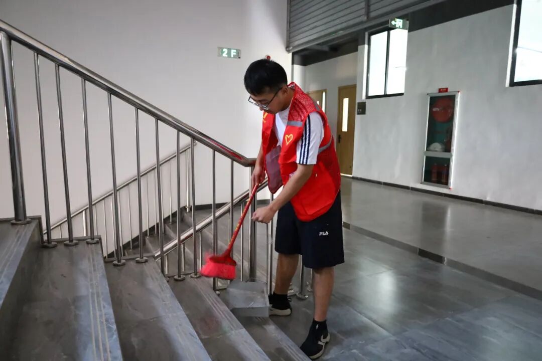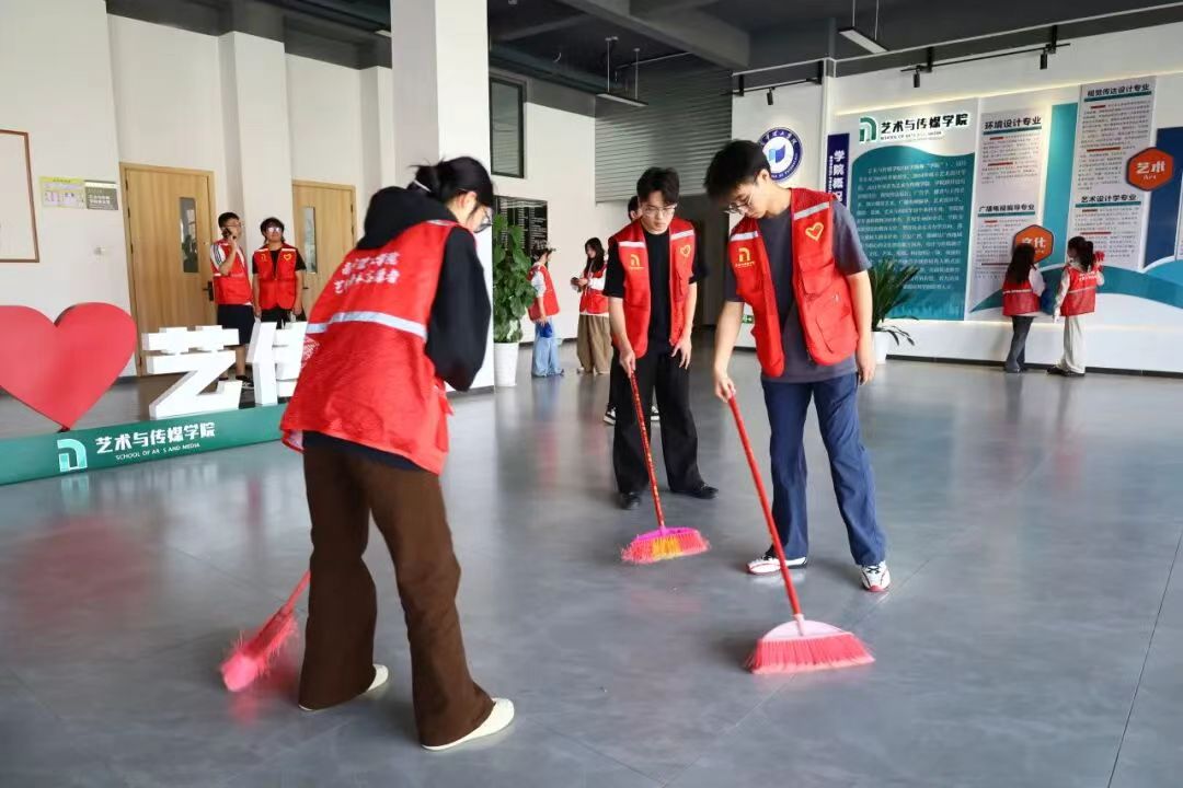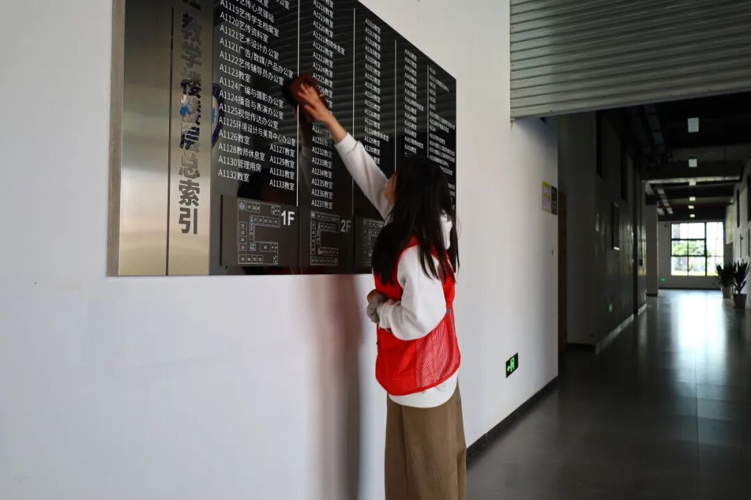 本次活动融合志愿服务与艺术创作,精心设置了三个环节。首先,学生志愿者们拿起工具,认真清扫校园教学楼以及教学楼周边卫生,并仔细擦拭教学楼标识牌,以实际行动诠释劳动光荣与奉献精神。