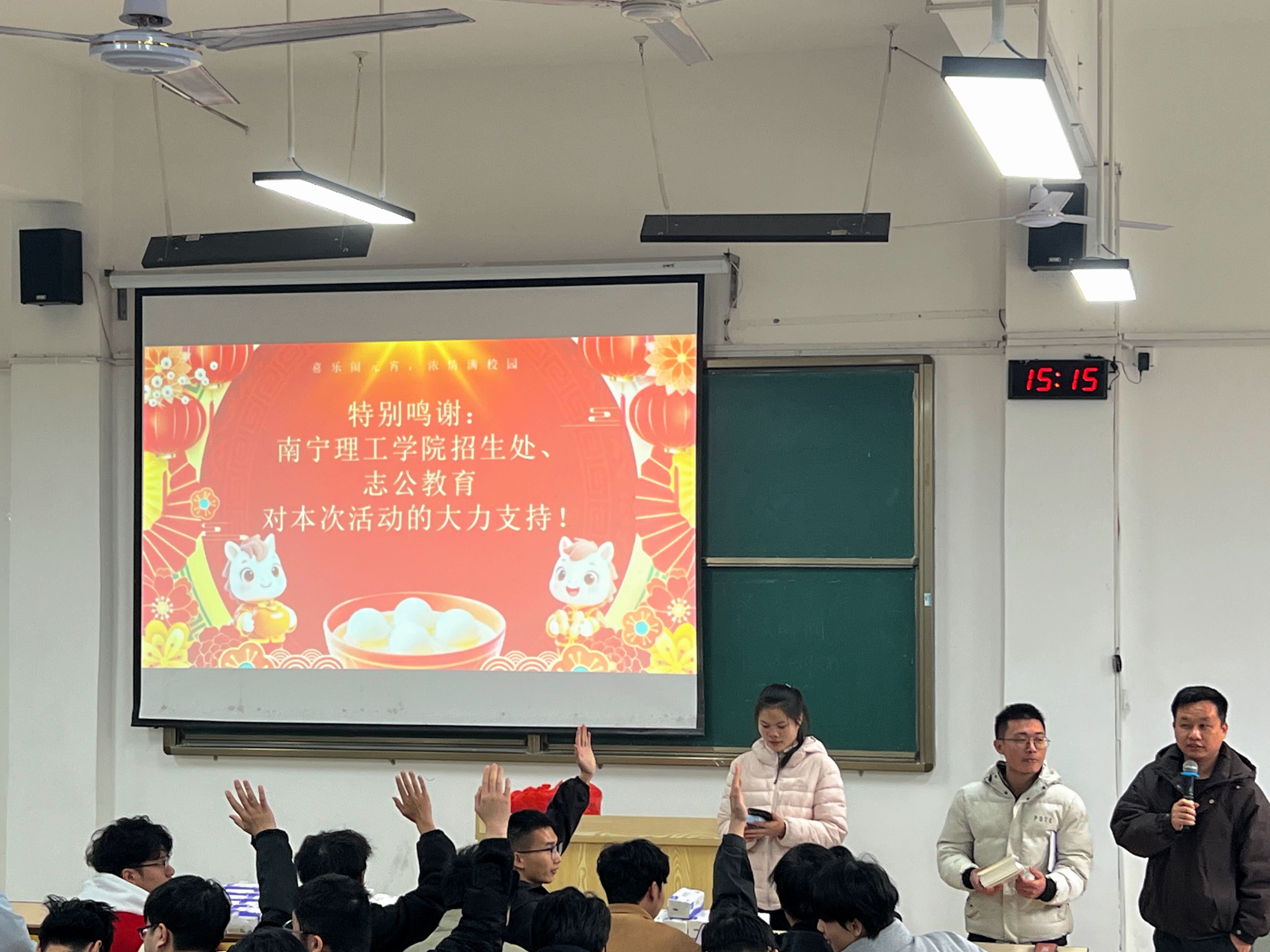 各班级分会场在辅导员的精心组织及志公教育的大力支持下同步开展,以“班级小团圆”为特色,打造了各具特色的喜乐氛围。分会场活动以猜字谜、幸运抽奖为主,穿插趣味问答、节日分享等环节。猜字谜环节聚焦汉字文化,谜题兼具趣味性与知识性,同学们积极抢答,在游戏中感受传统文化魅力;幸运抽奖环节设置了学习用品、节日福袋等丰富奖品,现场惊喜连连,欢呼声不断。辅导员们借此机会与学生亲切交流,了解假期生活与新学期规划,叮嘱大家合理规划学习生活,现场气氛温馨而热烈。