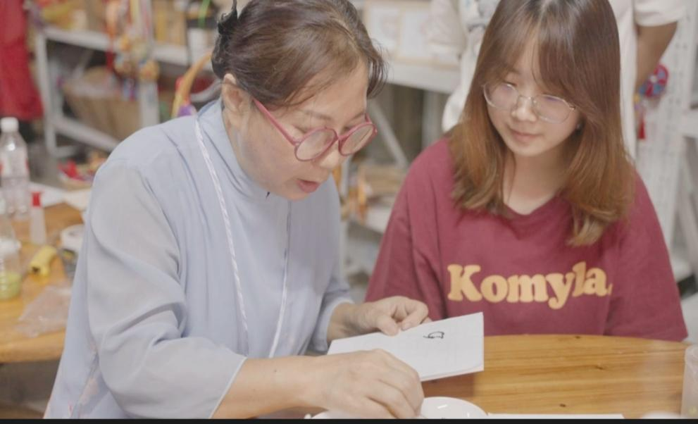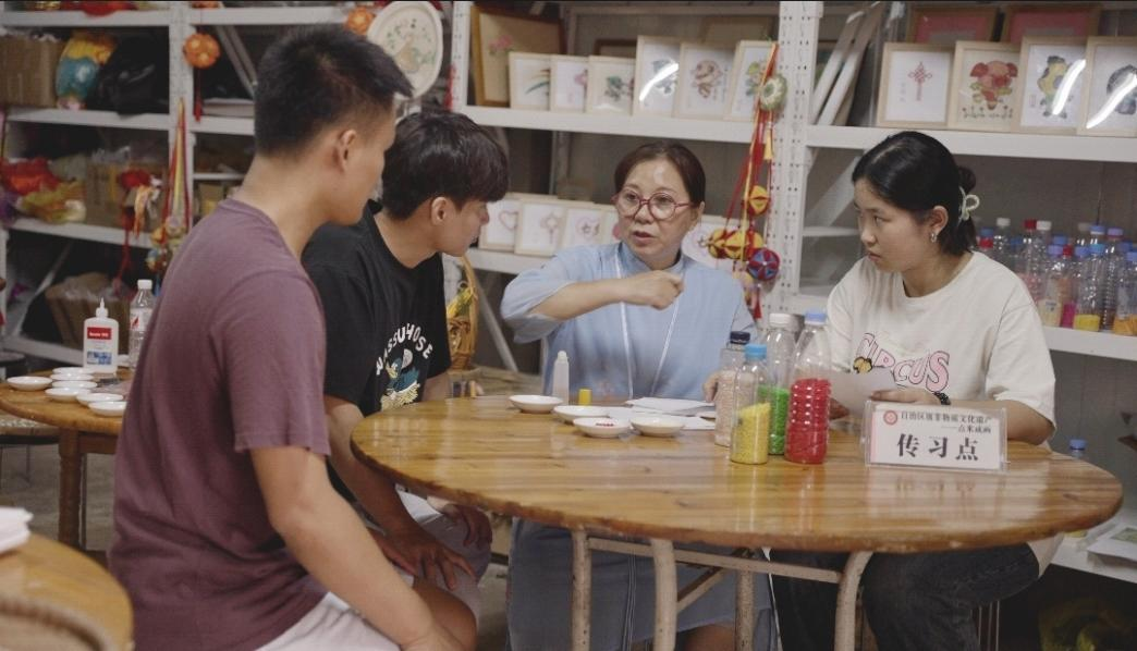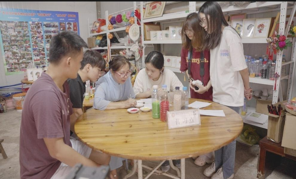 视频拍摄间隙,曹文碧老师现场开展点米成画技艺教学,将非遗技艺手把手传授给团队成员。曹老师从基础的米粒挑选、染色技巧讲起,一步步示范构图排版与粘黏手法,耐心纠正成员们的操作误区。团队成员围在一旁认真观摩、踊跃尝试,从生疏操作到慢慢掌握要领,在亲手创作中感受米粒作画的独特乐趣,真切体会传统手工艺的精细与考究,实现了从理论认知到实操实践的跨越,也让非遗技艺在青年学子手中得到鲜活传承。
