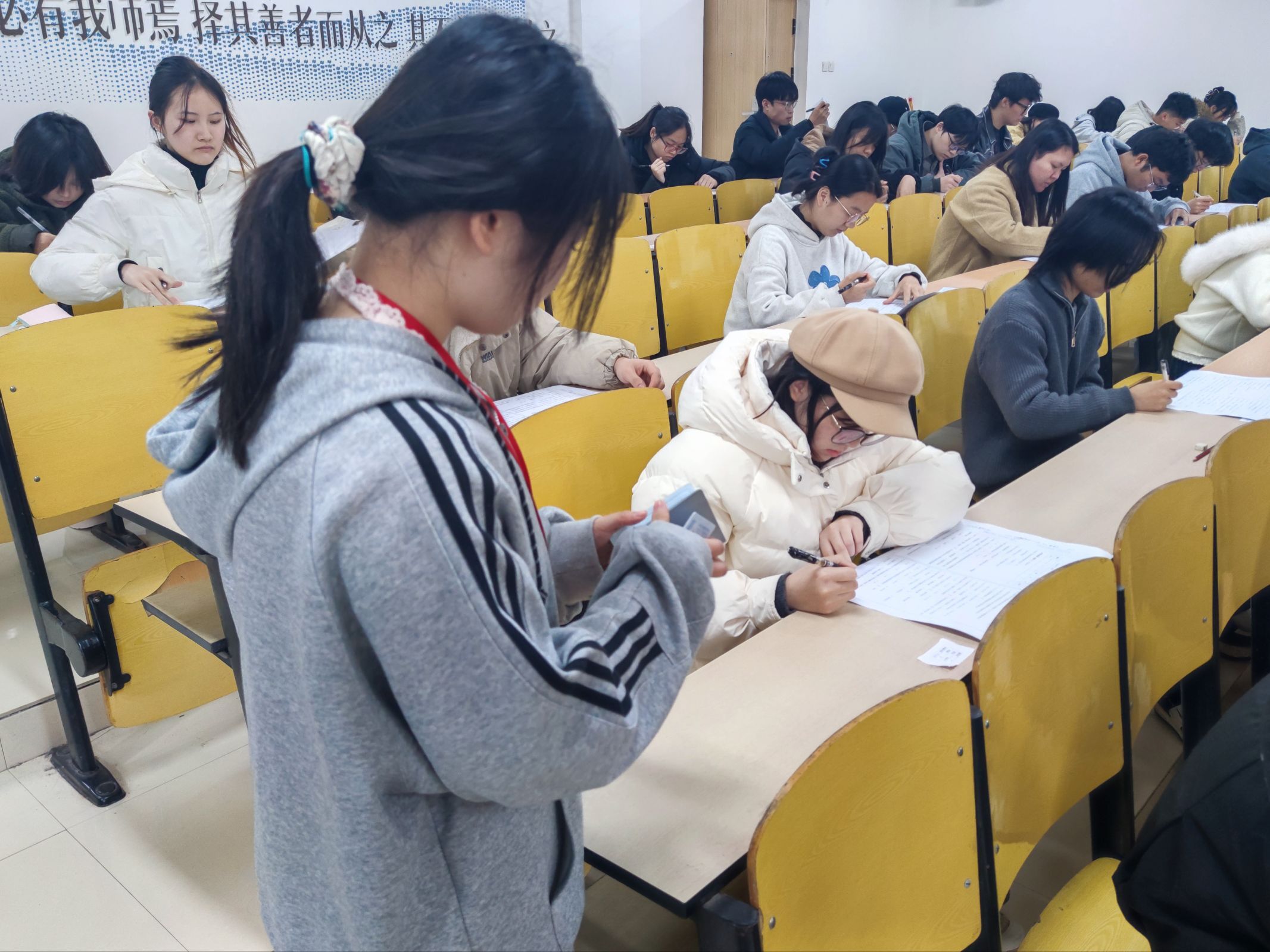 本次考试由学院党建工作组杨苗培老师及党员服务中心工作人员担任监考。考前,杨老师着重强调考试纪律,要求同学们坚守共产党人 “实事求是” 的优良作风,独立思考、诚信应考。考试采取闭卷笔试形式,全程独立作答,严禁携带电子设备与复习资料,考场秩序井然、纪律严明,监考人员认真履职,确保考试公平公正,真实检验入党积极分子的理论水平与政治素养。
